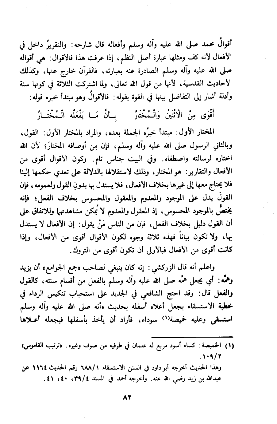 الْمُخْتَار الأول مُبْتَدأ خَبره الْجُمْلَة بعده وَالْمرَاد بالمختار الأول القَوْل وَبِالثَّانِي الرَّسُول صلى الله عَلَيْهِ وَسلم فَإِن من أَوْصَافه الْمُخْتَار لِأَن الله اختارة لرسالته واصطفاه وَفِي الْبَيْت جناس تَامّ وَكَون الْأَقْوَال أقوى من الْأَفْعَال والتقارير وَهُوَ الْمُخْتَار وَذَلِكَ لاستقلالها بِالدّلَالَةِ على تعدِي حكمهَا إِلَيْنَا فَلَا يحْتَاج مَعهَا إِلَى غَيرهَا بِخِلَاف الْأَفْعَال فَلَا يسْتَدلّ بهَا بِدُونِ القَوْل ولعمومه فَإِن القَوْل يدل على الْمَوْجُود والمعدوم والمعقول والمحسوس بِخِلَاف الْفِعْل فَإِنَّهُ يخْتَص بالموجود المحسوس إِذْ الْمَعْقُول والمعدوم لَا يُمكن مشاهدتهما وللاتفاق على أَن القَوْل دَلِيل بِخِلَاف الْفِعْل فَإِن من النَّاس من يَقُول إِن الْأَفْعَال لَا يسْتَدلّ بهَا وَلَا تكون بَيَانا فَهَذِهِ ثَلَاثَة وُجُوه لكَون الْأَقْوَال أقوى من الْأَفْعَال وَإِذا كَانَت أقوى من الْأَفْعَال فبالأولى أَن تكون أقوى من التروك