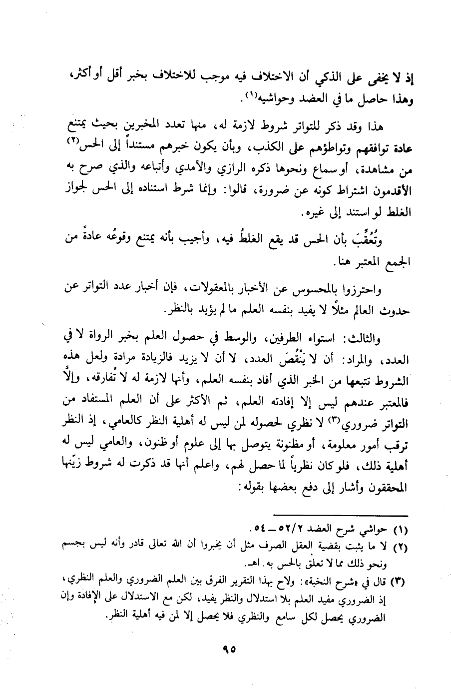 وَالثَّالِث اسْتِوَاء الطَّرفَيْنِ وَالْوسط فِي حُصُول الْعلم بِخَبَر الروَاة لَا فِي الْعدَد وَالْمرَاد أَن لَا ينقص الْعدَد لَا أَن لَا يزِيد فَالزِّيَادَة مُرَادة وَلَعَلَّ هَذِه الشُّرُوط تتبعها من الْخَبَر الَّذِي أَفَادَ بِنَفسِهِ الْعلم وَأَنَّهَا لَازِمَة لَهُ لَا تُفَارِقهُ وَإِلَّا فَالْمُعْتَبر عِنْدهم لَيْسَ إِلَّا إفادته الْعلم ثمَّ الْأَكْثَر على أَن الْعلم الْمُسْتَفَاد من التَّوَاتُر ضَرُورِيّ لَا نَظَرِي لحصوله لمن لَيْسَ لَهُ أَهْلِيَّة النّظر كالعامي إِذْ النّظر ترقب أُمُور مَعْلُومَة أَو مظنونة يتَوَصَّل بهَا إِلَى عُلُوم أَو ظنون والعامي لَيْسَ لَهُ أَهْلِيَّة ذَلِك فَلَو كَانَ نظريا لما حصل لَهُم وَاعْلَم أَنَّهَا قد ذكرت لَهُ شُرُوط زينها الْمُحَقِّقُونَ وَأَشَارَ إِلَى دفع بَعْضهَا بقوله
