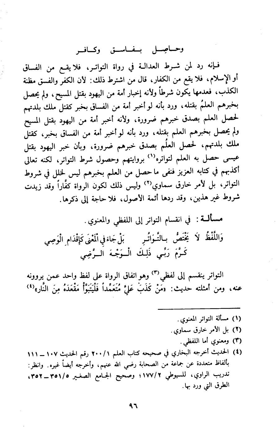 فَإِنَّهُ رد لمن شَرط الْعَدَالَة فِي رُوَاة التَّوَاتُر فَلَا يَقع من الْفُسَّاق أَو الْإِسْلَام فَلَا يَقع من الْكفَّار قَالَ من اشْترط ذَلِك لِأَن الْكفْر وَالْفِسْق مَظَنَّة الْكَذِب فعدمها يكون شرطا وَلِأَنَّهُ إِخْبَار أمة من الْيَهُود بقتل الْمَسِيح وَلم يحصل بخبرهم الْعلم بقتْله ورد بِأَنَّهُ لَو أخبر أمة من الْفُسَّاق بِخَبَر كَقَتل ملك بلدتهم لحصل الْعلم بِصدق خبرهم ضَرُورَة وَلِأَنَّهُ أخبر أمة من الْيَهُود بقتل الْمَسِيح وَلم يحصل بخبرهم الْعلم بقتْله ورد بِأَنَّهُ لَو أخبر أمة من الْفُسَّاق بِخَبَر كَقَتل ملك بلدتهم لحصل الْعلم بِصدق خبرهم ضَرُورَة وَبِأَن خبر الْيَهُود بقتل عِيسَى حصل بِهِ الْعلم لتواتره بروايتهم وَحُصُول شَرط التَّوَاتُر لكنه تَعَالَى أكذبهم فِي كِتَابه الْعَزِيز فنفى مَا حصل من الْعلم بخبرهم لَيْسَ لخلل فِي شُرُوط التَّوَاتُر بل لأمر خارق سماوي وَلَيْسَ ذَلِك لكَون الروَاة كفَّارًا وَقد زيدت شُرُوط غير هذَيْن وَقد ردهَا أَئِمَّة الْأُصُول فَلَا حَاجَة إِلَى ذكرهَا