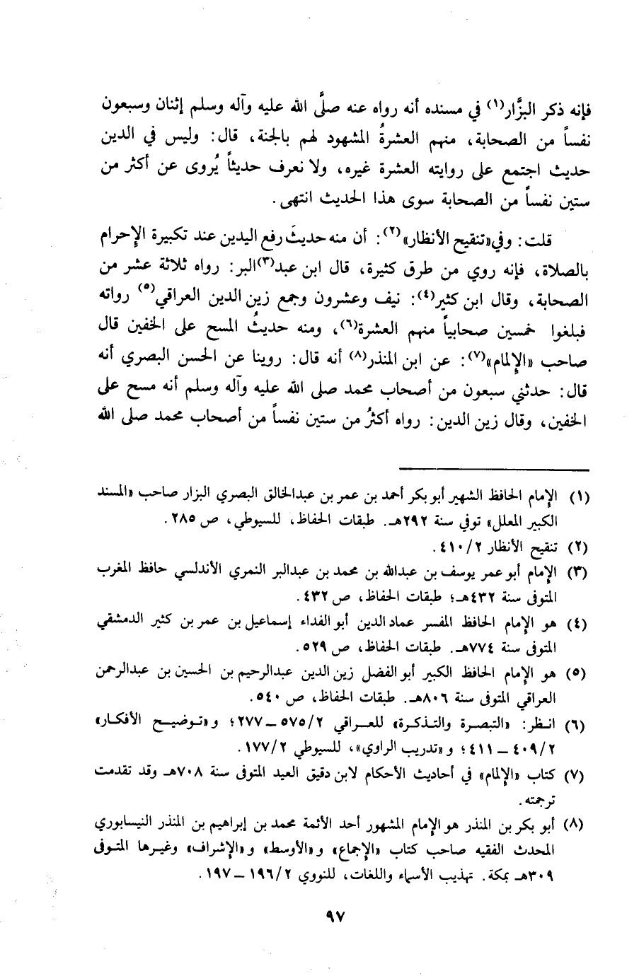 قلت وَفِي تَنْقِيح الأنظار أَن مِنْهُ حَدِيث رفع الْيَدَيْنِ عِنْد تَكْبِيرَة الْإِحْرَام بِالصَّلَاةِ فَإِنَّهُ رُوِيَ من طرق كَثِيرَة قَالَ ابْن عبد الْبر رَوَاهُ ثَلَاثَة عشر من الصَّحَابَة وَقَالَ ابْن كثير نَيف وَعِشْرُونَ وَجمع زين الدّين الْعِرَاقِيّ رُوَاته فبلغوا خمسين صحابيا مِنْهُم الْعشْرَة وَمِنْه حَدِيث الْمسْح على الْخُفَّيْنِ قَالَ صَاحب الْإِلْمَام عَن ابْن الْمُنْذر أَنه قَالَ روينَا عَن الْحسن الْبَصْرِيّ أَنه قَالَ حَدثنِي سَبْعُونَ من أَصْحَاب مُحَمَّد صلى الله عَلَيْهِ وَسلم أَنه مسح على الْخُفَّيْنِ وَقَالَ زين الدّين رَوَاهُ أَكثر من سِتِّينَ نفسا من أَصْحَاب مُحَمَّد صلى الله