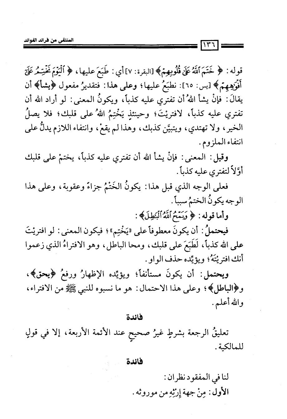 قوله: (خَتَمَ اللَّهُ عَلَى قُلُوبِهِمْ) (البقرة: 7) أي: طبع عليها، (الْيَوْمَ نَخْتِمُ عَلَى أَفْوَاهِهِم) (يّس: 65) نطبع عليها؛ وعلى هذا: فتقدير مفعول (يَشَأِ) أن يقال: فإن يشأ الله أن تفتري عليه كذباً، ويكون المعنى: لو أراد الله أن تفتري عليه كذباً، لافتريت؛ وحينئذ يختم الله على قلبك؛ فلا يصل الخير، ولا تهتدي، ويتبين كذبك، وهذا لم يقع، وانتفاء اللازم يدل على انتفاء الملزوم.