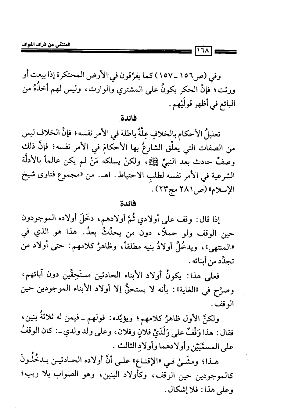 وفي (ص156-157) كما يفرقون في الأرض المحتكرة إذا بيعت أو ورثت؛ فإن الحكر يكون على المشتري والوارث، وليس لهم أخذه من البائع في أظهر قوليهم.