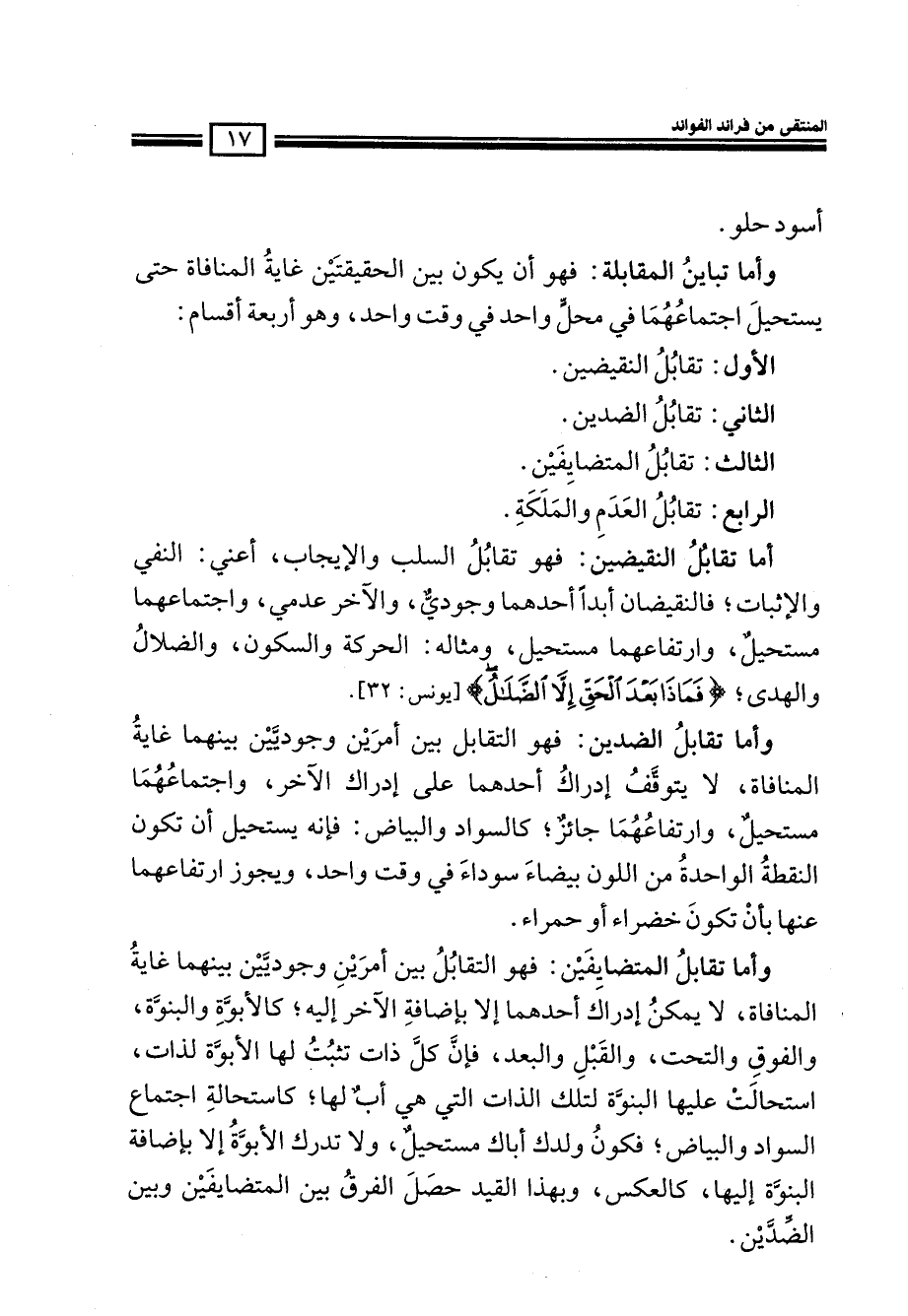 أما تقابل النقيضين: فهو تقابل السلب والإيجاب، أعني: النفي والإثبات؛ فالنقيضان أبداً أحدهما وجودي، والآخر عدمي، واجتماعهما مستحيل، وارتفاعهما مستحيل، ومثاله: الحركة والسكون، والضلال والهدى؛ (فَمَاذَا بَعْدَ الْحَقِّ إِلا الضَّلالُ) (يونس: 32) .