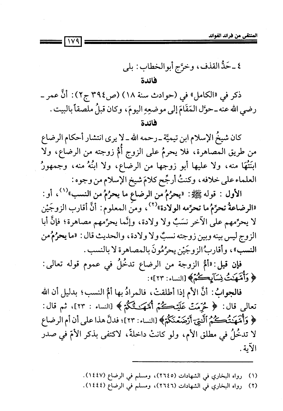 كان شيخ الإسلام ابن تيمية- رحمه الله- لا يرى انتشار أحكام الرضاع من طريق المصاهرة، فلا يحرم على الزوج أم زوجته من الرضاع، ولا ابنتها منه، ولا عليها أبو زوجها من الرضاع، ولا ابنه منه، وجمهور العلماء على خلافة، وكنت أرجح كلام شيخ الإسلام من وجوه.