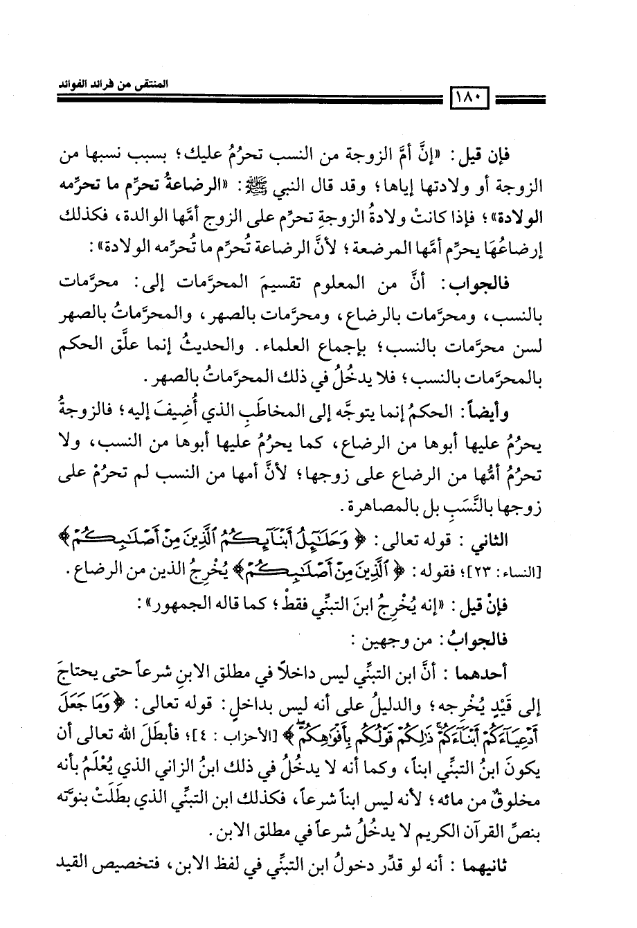 الثاني: قوله تعالى: (وَحَلائِلُ أَبْنَائِكُمُ الَّذِينَ مِنْ أَصْلبِكُم) (النساء: 23) فقوله: (الَّذِينَ مِنْ أَصْلبِكُمْ) (النساء: 23) يخرج الذين من الرضاع.