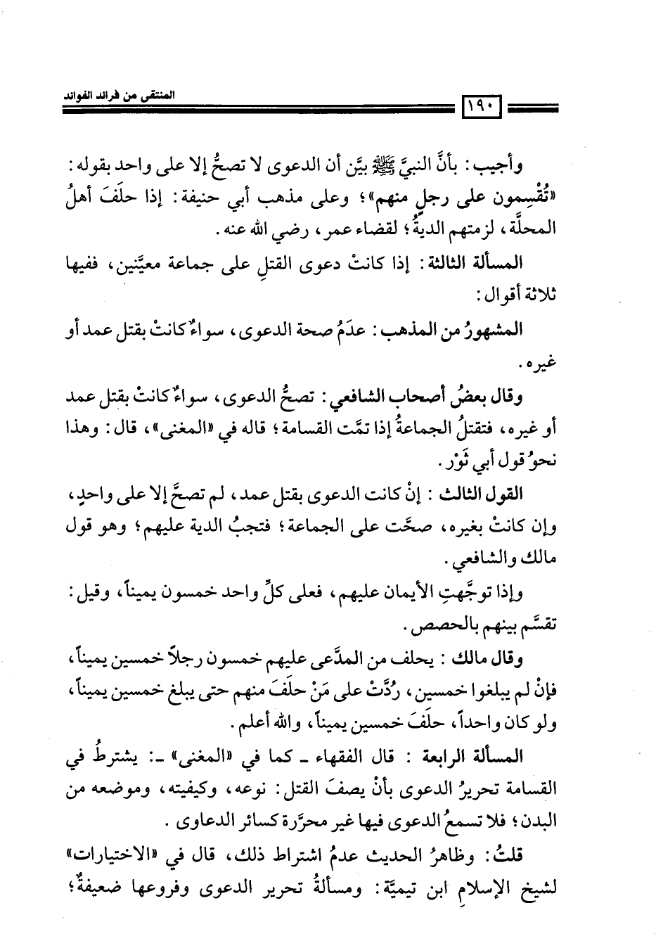 المسألة الرابعة: قال الفقهاء- كما في ((المغني)) -: يشترط في القسامة تحرير الدعوى بأن يصف القتل نوعه، وكيفيته، وموضعه من البدن؛ فلا تسمع الدعوى فيها غير محررة كسائر الدعاوى.