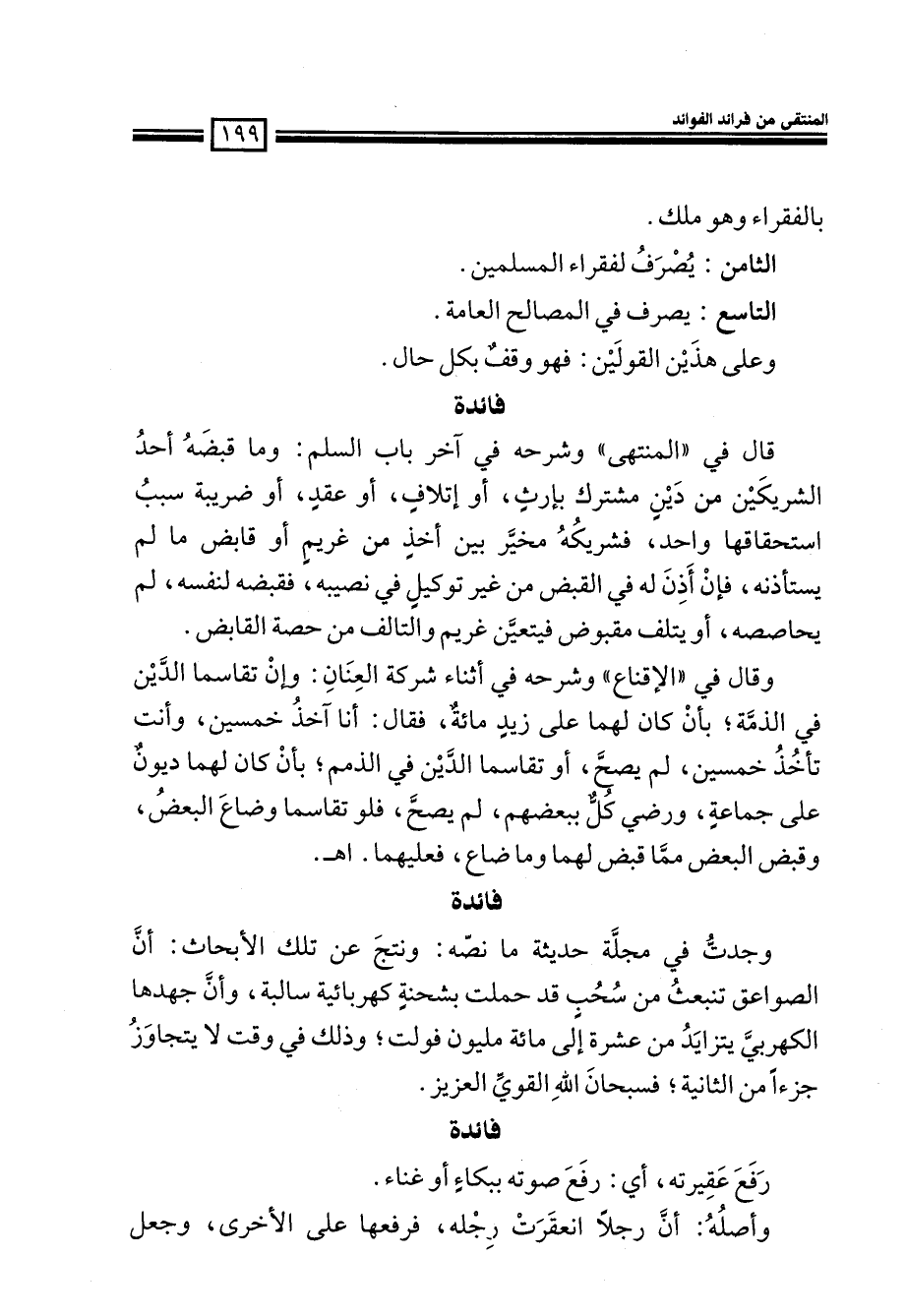 قال في ((المنتهي)) وشرحه في آخر باب السلم: وما قبضه أحد الشريكين من دين مشترك بإرث، أو إتلاف، أو عقد، أو ضريبة سبب استحقاقها واحد، فشريكه مخير بين أخذ من غريم أو قابض ما لم يستأذنه، فإن أذن له في القبض من غير توكيل في نصيبه، فقبضه لنفسه، لم يحاصصه، أو يتلف مقبوض فيتعين غريم والتالف من حصة القابض.