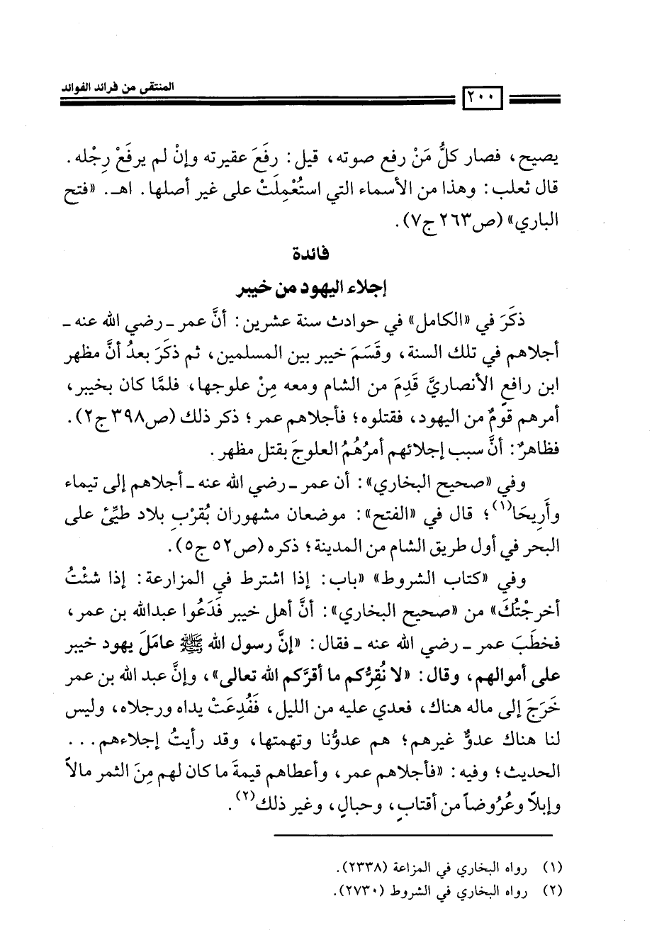 وفي ((كتاب الشروط)) ((باب: إذا اشترط في المزارعة: إذا شئت أخرجتك)) من ((صحيح البخاري)) : أن أهل خيبر فدعوا عبد الله بن عمر، فخطب عمر- رضي الله عنه- فقال: ((إن رسول الله صلى الله عليه وسلم عامل يهود خيبر على أموالهم، وقال: ((لا نقركم ما أقركم الله تعالى)) ، وإن عبد الله بن عمر خرج إلى ماله هناك، فعدي عليه من الليل، ففدعت يداه ورجلاه، وليس لنا هناك عدو غيرهم، هم عدونا وتهمتها، وقد رأيت إجلاءهم ... الحديث؛ وفيه: ((فأجلاهم عمر، وأعطاهم قيمة ما كان لهم من الثمر مالاً وإبلا وعروضاً من أقتاب، وحبال، وغير ذلك (¬2) .