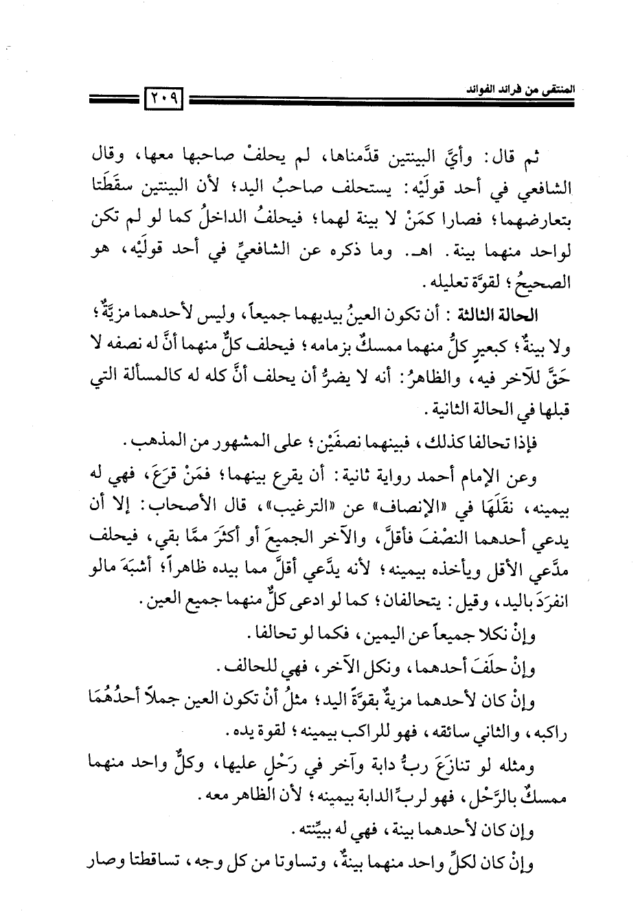 وعن الإمام أحمد رواية ثانية: أن يقرع بينهما؛ فمن قرع، فهي له بيمينه، نقلها في ((الإنصاف)) عن ((الترغيب)) ، قال الأصحاب: إلا أن يدعى أحدهما النصف فأقل، والآخر الجميع أو أكثر مما بقي، فيحلف مدعي الأقل ويأخذه بيمينه، لأنه يدعى أقل مما بيده ظاهراً، أشبه ما لو انفرد باليد، وقيل: يتحالفان، كما لو ادعى كل منهما جميع العين.