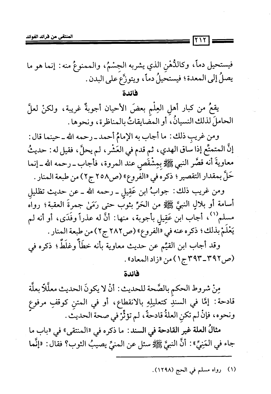 ومن غريب ذلك: جواب ابن عقيل- رحمه الله- عن حديث تظليل أسامة أو بلال النبي صلى الله عليه وسلم من الحر بثوب حتى رمى جمرة العقبة، رواه مسلم (¬1) أجاب ابن عقيل بأجوبة، منها: أن له عذراً وفدى أو أنه لم يعلم بذلك، ذكره عنه في ((الفروع)) (ص282ج2) من طبعة المنار.