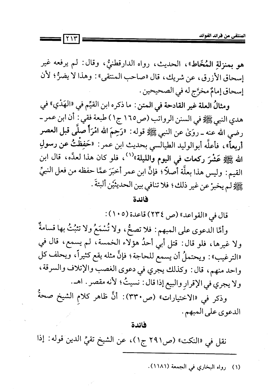 ومثال العلة غير القادحة في المتن: ما ذكره ابن القيم في ((الهدي)) في هدي النبي صلى الله عليه وسلم في السنن الرواتب (165ج1) طبعة فقي: أن ابن عمر- رضي الله عنه- روي عن النبي صلى الله عليه وسلم قوله: ((رحم الله امرأً صلى قبل العصر أربعاً)) ، فأعله أبو الوليد الطيالسي بحديث ابن عمر: ((حفظت عن رسول الله صلى الله عليه وسلم عشر ركعات في اليوم والليلة)) (¬1) ، فلو كان هذا لعده، قال ابن القيم: وليس هذا بعلة أصلاً، فإن ابن عمر أخبر عما حفظه من فعل النبي صلى الله عليه وسلم لم يخبر عن غير ذلك؛ فلا تنافي بين الحديثين ألبته.