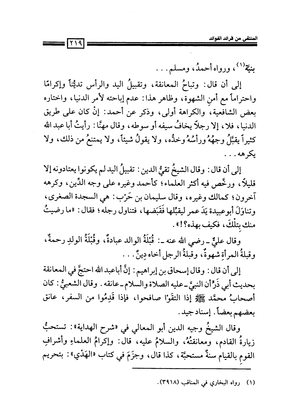 إلى أن قال: وتباح المعانقة، وتقبيل اليد والرأس تديناً وإكراماً واحتراماً مع أمن الشهوة، وظاهر هذا: عدم إباحته لأمر الدنيا، واختاره بعض الشافعية، والكراهة أولى، وذكر عن أحمد: إن كان على طريق الدنيا، فلا، إلا رجلاً يخاف سيفه أو سوطه، وقال مهنا: رأيت أبا عبد الله كثيراً يقبل وجهه ورأسه وخده، ولا يقول شيئاً، ولا يمتنع من ذلك، ولا يكرهه.