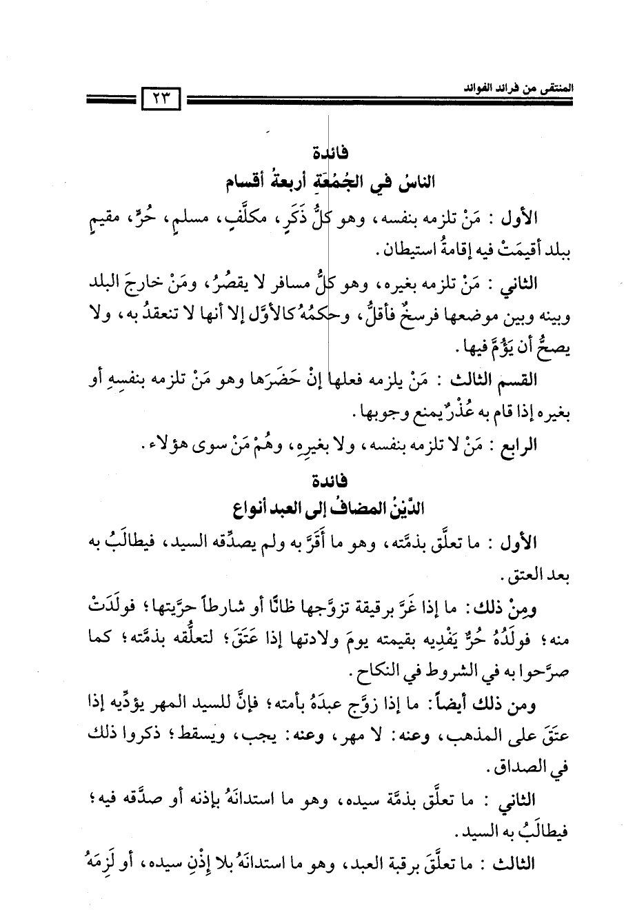 الأول: من تلزمه بنفسه، وهو كل ذكر، مكلف، مسلم، حر، مقيم ببلد أقيمت فيه إقامة استيطان.