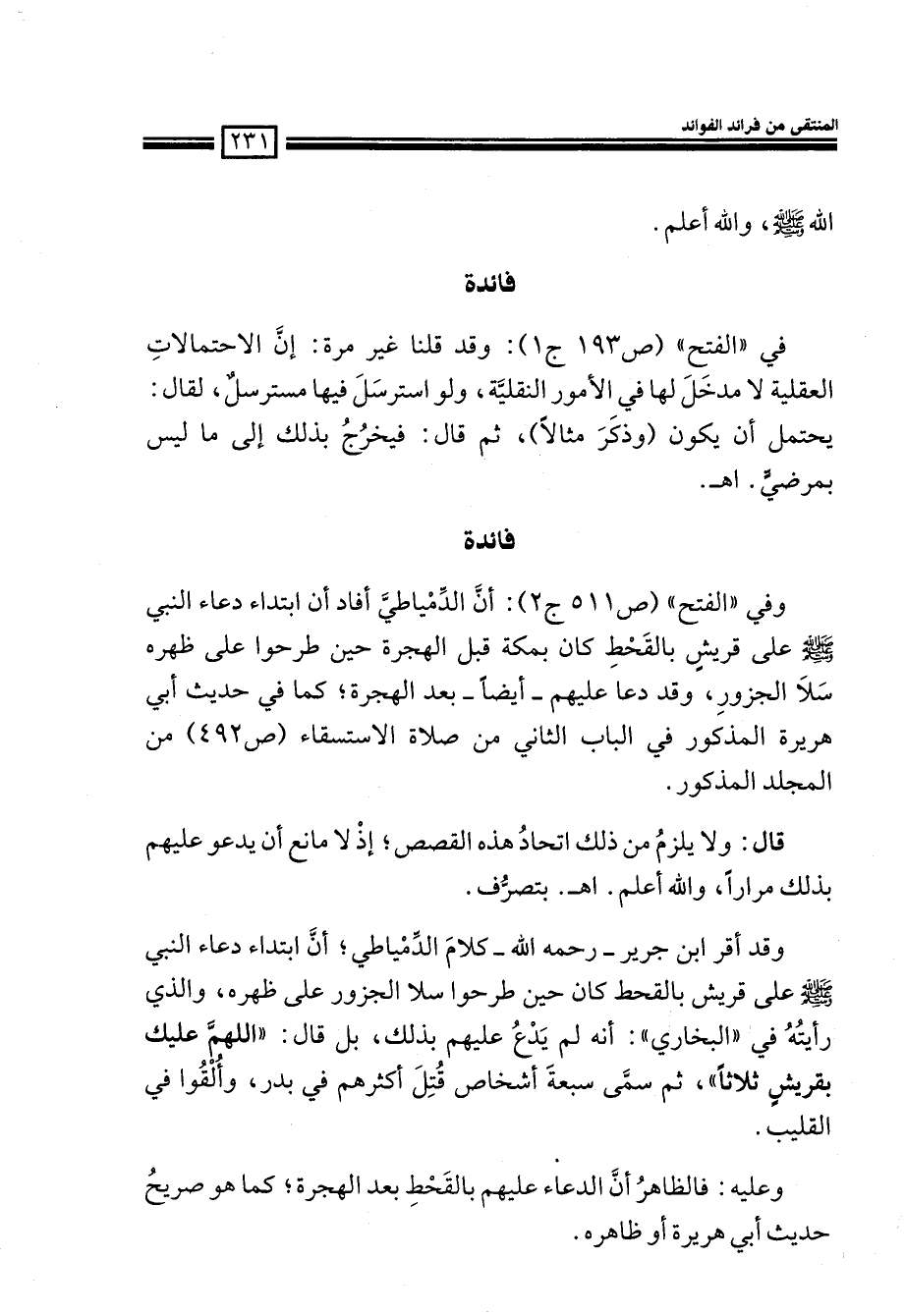 وفي ((الفتح)) (ص511ج2) : أن الدمياطي أفاد أن ابتداء دعاء النبي صلى الله عليه وسلم على قريش بالقحط كان بمكة قبل الهجرة حين طرحوا على ظهره سلا الجزور، وقد دعا عليهم، أيضاً- بعد الهجرة، كما في حديث أبي هريرة المذكور في الباب الثاني من صلاة الاستسقاء (ص492) من المجلد المذكور.