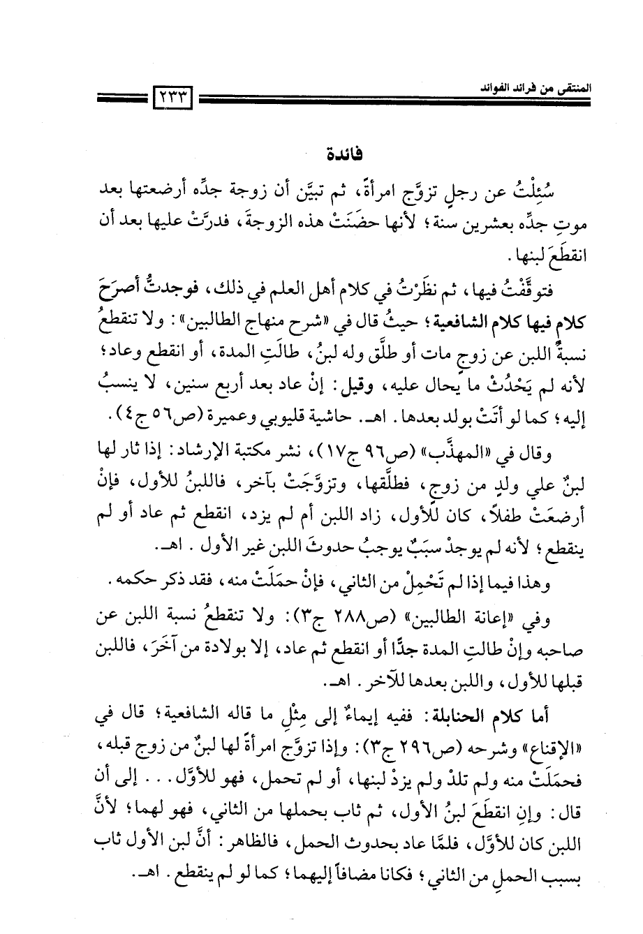 فتوقفت فيها، ثم نظرت في كلام أهل العلم في ذلك، فوجدت أصرح كلام فيها كلام الشافعية، حيث قال في ((شرح منهاج الطالبين)) : ولا تنقطع نسبة اللبن عن زوج مات أو طلق وله لبن، طالت المدة، أو انقطع وعاد؛ لأنه لم يحدث ما يحال عليه، وقيل: إن عاد بعد أربع سنين، لا ينسب إليه؛ كما لو أتت بولد بعدها. اهـ. حاشية قليوبي وعميرة (ص56ج4) .