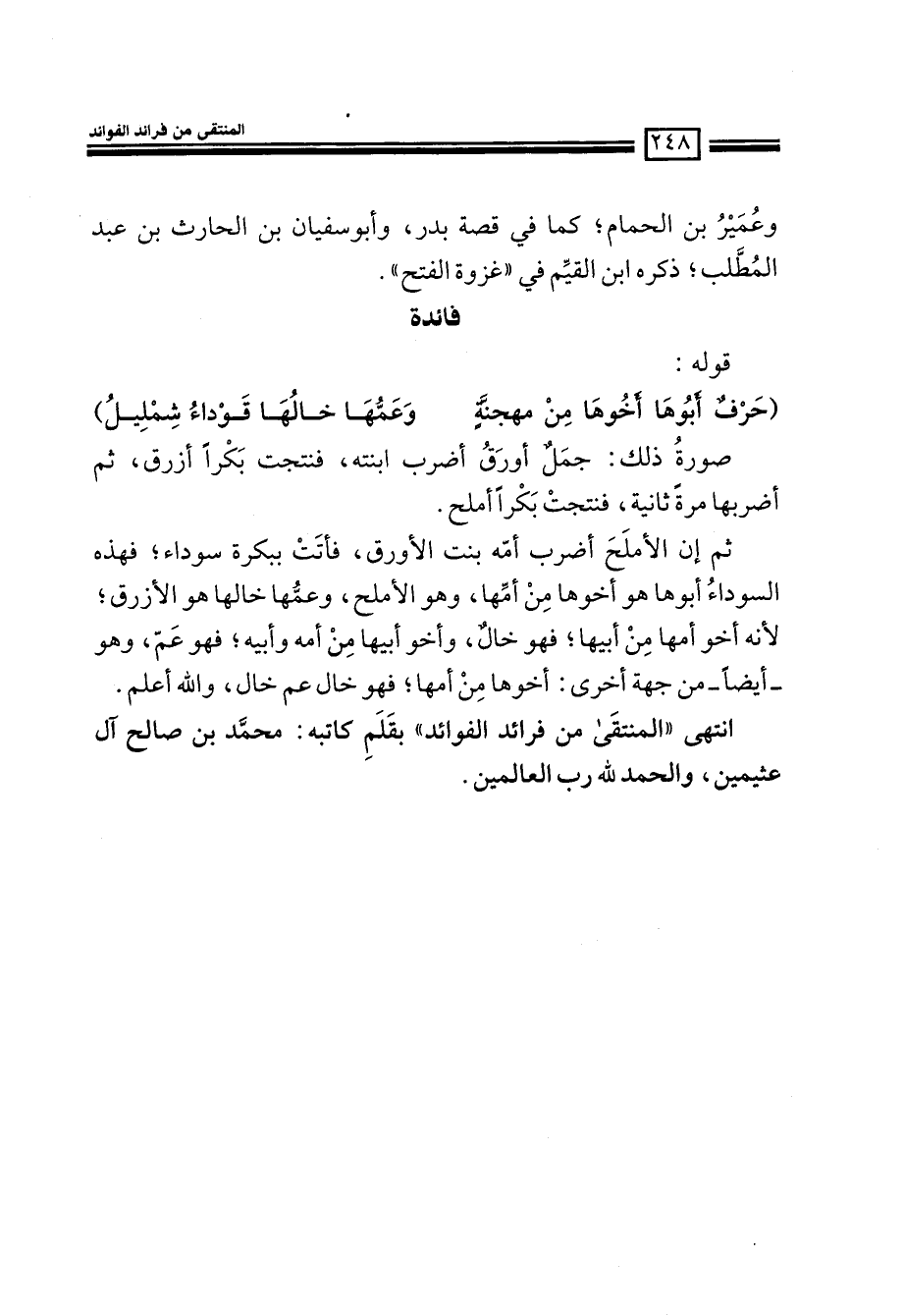 ثم أن الأملح أضرب أمه بنت الأورق، فأتت ببكرة سوداء؛ فهذه السوداء أبوها هو أخوها من أمها، وهو الأملح، وعمها خالها هو الأزرق، لأنه أخو أمها من أبيها، فهو خال، وأخو أبيها من أمه وأبيه، فهو عم، وهو - أيضا- من جهة أخرى: أخوها من أمها؛ فهو خال عم خال، والله أعلم.