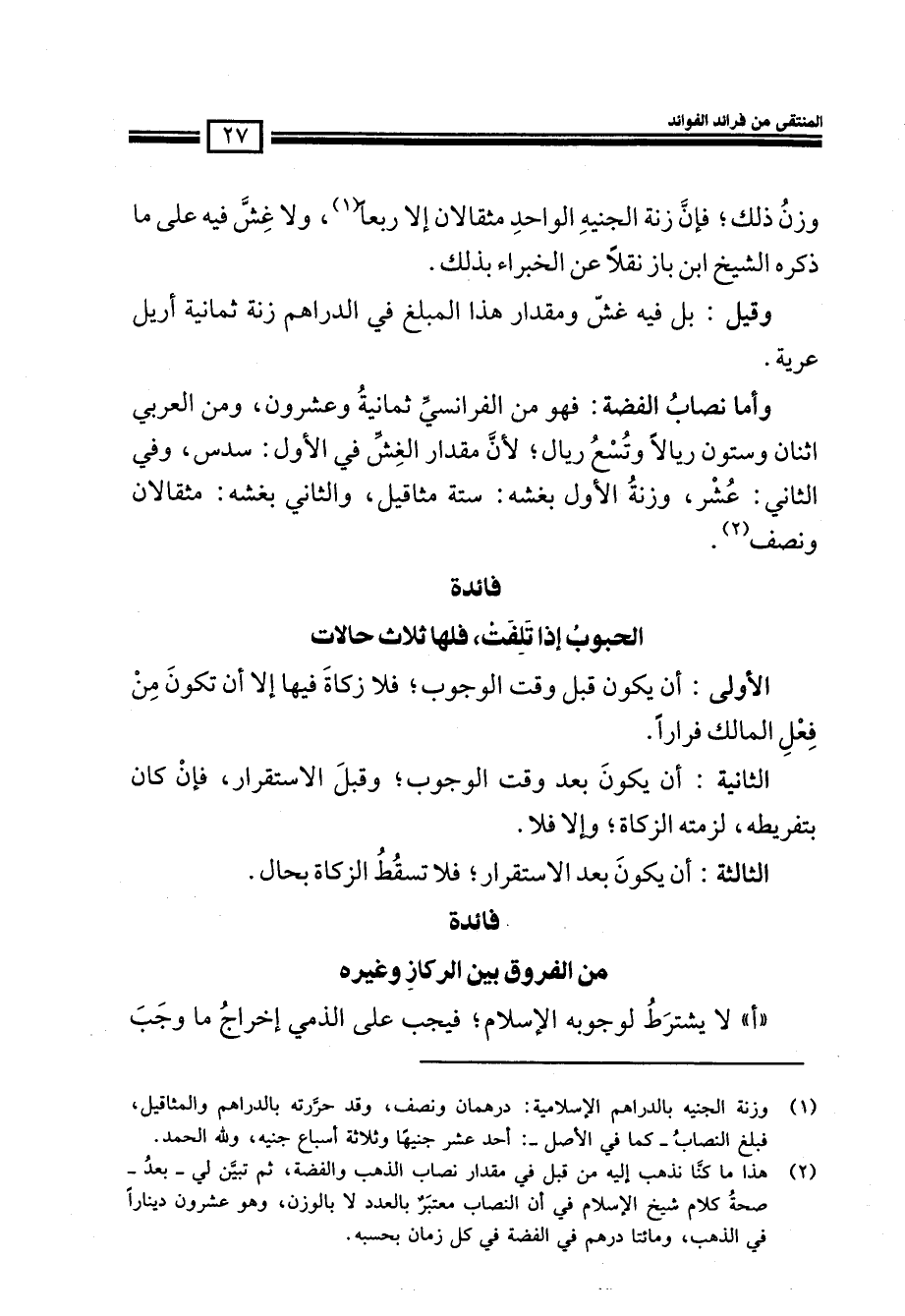 (¬1) وزنة الجنيه بالدراهم الإسلامية: درهمان ونصف، وقد حررته بالدراهم والمثاقيل، فبلغ النصاب- كما في الأصل-: أحد عشر جنيهاً وثلاثة أسباع جنيه، ولله الحمد.