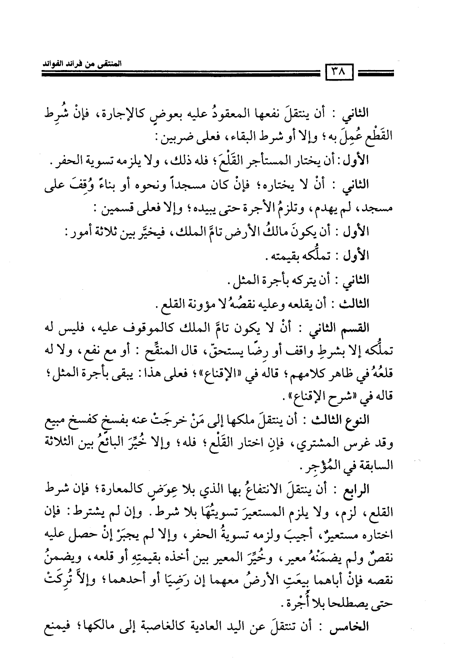 القسم الثاني: أن لا يكون تام الملك كالموقوف عليه، فليس له تملكه إلا بشرط واقف أو رضا يستحق، قال المنقح: أو مع نفع، ولا له قلعه في ظاهر كلامهم؛ قاله في ((الإقناع)) ؛ فعلى هذا: يبقى بأجرة المثل، قاله في ((شرح الإقناع)) .