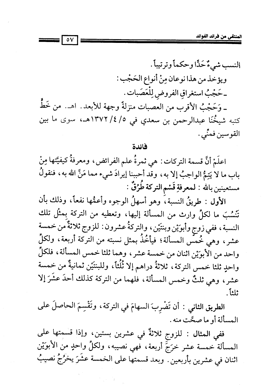 اعلم أن قسمة التركات هي ثمرة علم الفرائض، ومعرفة كيفيتها من باب ما لا يتم الواجب إلا به، وقد أحببنا إيراد شيء مما من الله به، فنقول مستعينين بالله: لمعرفة قسم التركة طرق: