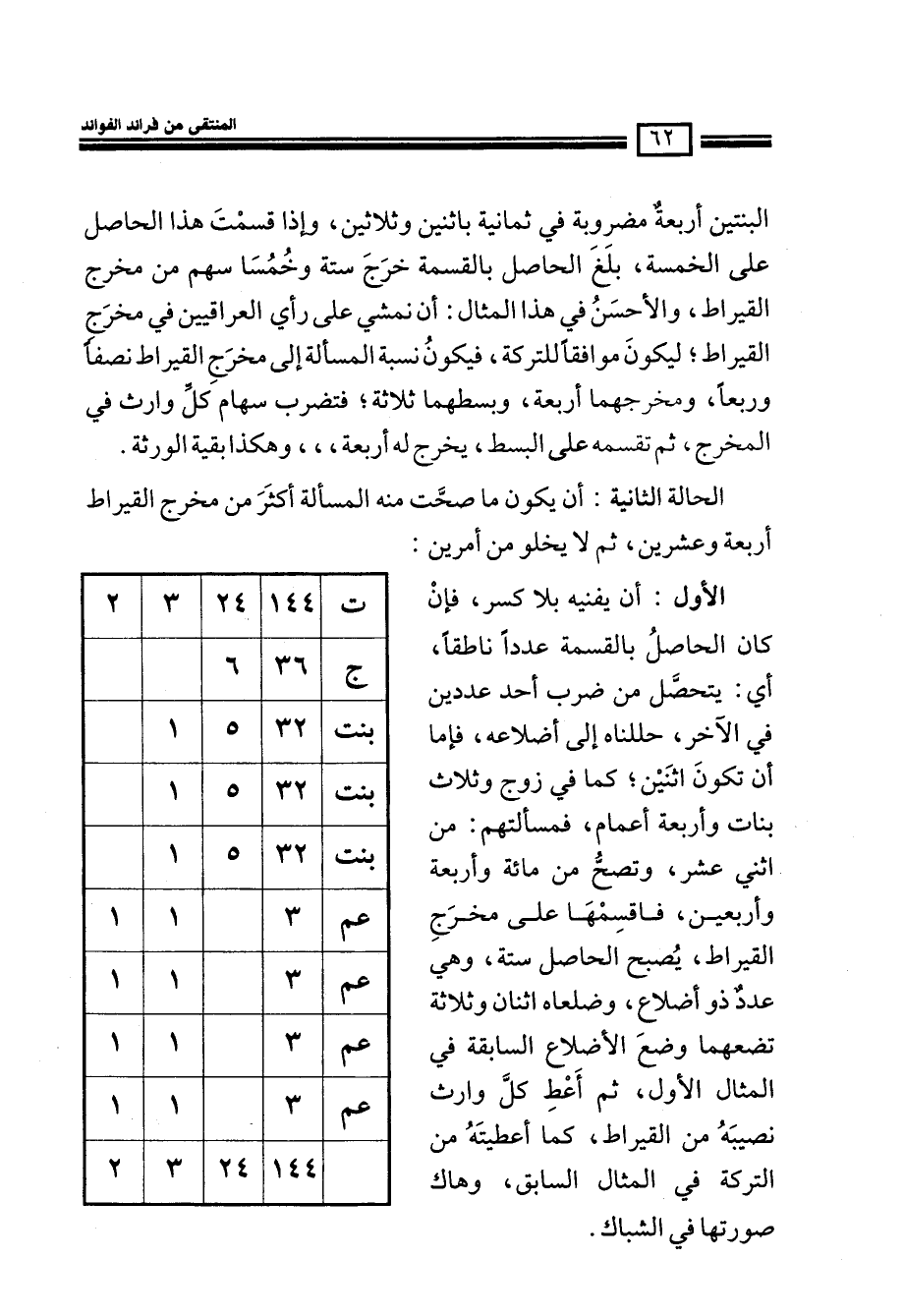 وتعمل في نصيب الأب عملك في نصيب الأم. ولكل واحدة من البنتين أربعة مضروبة في ثمانية باثنين وثلاثين، وإذا قسمت هذا الحاصل على الخمسة، بلغ الحاصل بالقسمة خرج ستة وخمسا سهم من مخرج القيراط؛ والأحسن في هذا المثال: أن نمشي على رأي العراقيين في مخرج القيراط؛ ليكون موافقاً للتركة، فيكون نسبة المسألة إلى مخرج القيراط نصفاً وربعا، ومخرجهما أربعة، وبسطهما ثلاثة، فتضرب سهام كل وارث في المخرج، ثم تقسمه على البسط، يخرج له أربعة،،، وهكذا بقية الورثة.