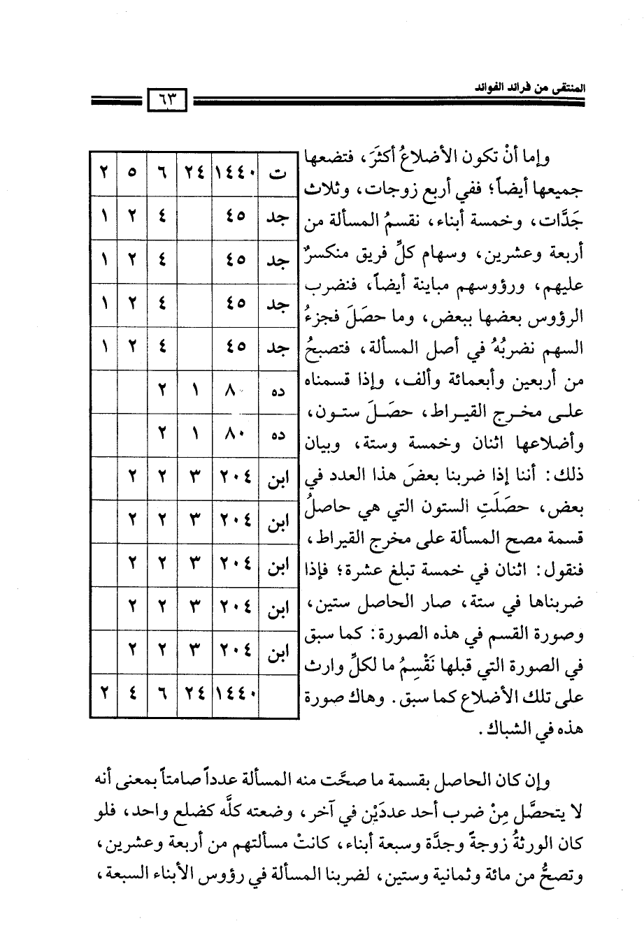 وإما أن تكون الأضلاع أكثر، فتضعها جميعها أيضاً، ففي أربع زوجات، وثلاث جدات، وخمسة أبناء، نقسم المسألة من أربعة وعشرين، وسهام كل فريق منكسر عليهم، ورؤوسهم مباينة أيضاً، فنضرب الرؤوس بعضها ببعض، وما حصل فجزء السهم نضربه في أصل المسألة، فتصح من أربعين وأربعمائة وألف، وإذا قسمناه على مخرج القيراط، حصل ستون، وأضلاعها اثنان وخمسة وستة، وبيان ذلك: أننا إذا ضربنا بعض هذا العدد في بعض، حصلت الستون التي هي حاصل قسمة مصح المسألة على مخرج القيراط، فنقول: اثنان في خمسة تبلغ عشرة؛ فإذا ضربناها في ستة، صار الحاصل ستين، وصورة القسم في هذه الصورة: كما سبق في الصورة التي قبلها نقسم ما لكل وارث على تلك الأضلاع كما سبق. وهاك صورة هذه في الشباك.