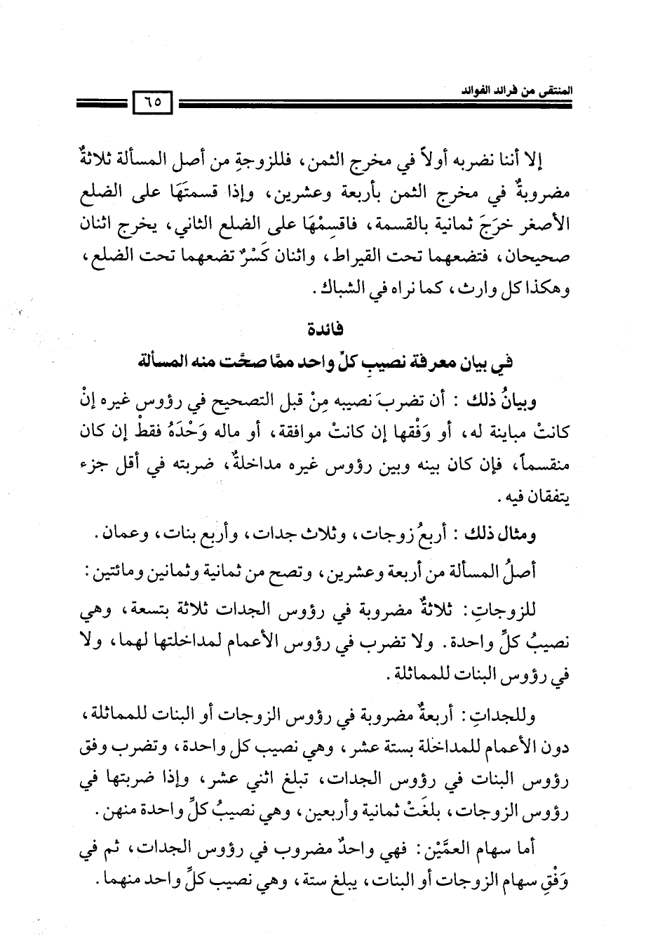 وللجدات: أربعة مضروبة في رؤوس الزوجات أو البنات للمماثلة، دون الأعمام للمداخلة بستة عشر، وهي نصيب كل واحدة وتضرب وفق رؤوس البنات في رؤوس الجدات، تبلغ اثني عشر، وإذا ضربتها في رؤوس الزوجات، بلغت ثمانية وأربعين، وهي نصيب كل واحد منهن.