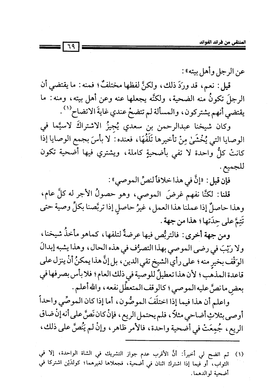 وكان شيخنا عبد الرحمن بن سعدي يجيز الاشتراك لا سيما في الوصايا التي يخشي من تأخيرها تلفها، فعنده: لا بأس بجمع الوصايا إذا كانت كل واحدة لا تفي بأضحية كاملة، ويشتري فيها أضحية تكون للجميع.