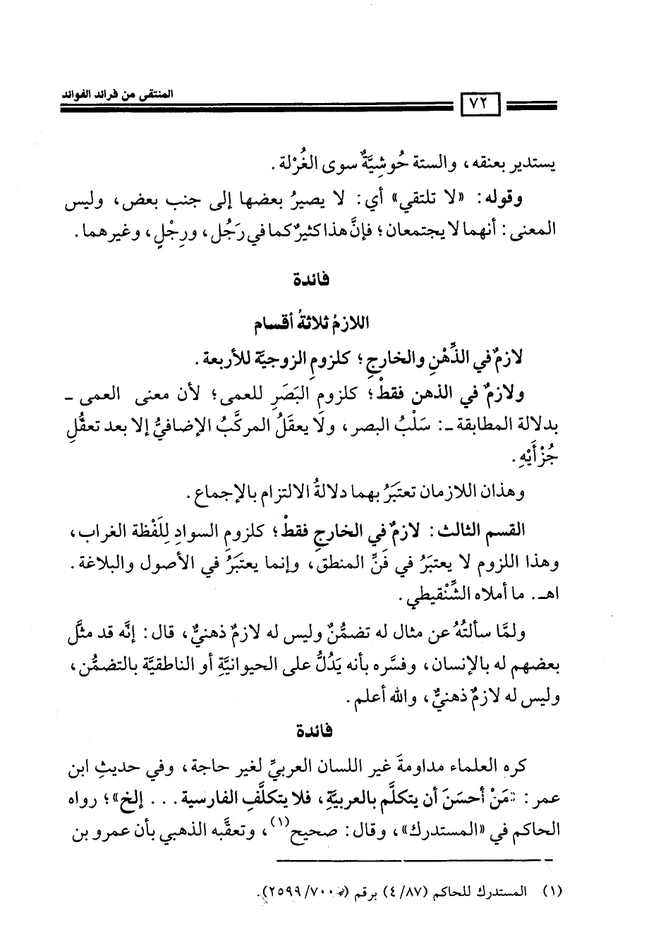 كره العلماء مداومة غير اللسان العربي لغير حاجة، وفي حديث ابن عمر: ((من أحسن أن يتكلم بالعربية، فلا يتكلف الفارسية ... إلخ)) ؛ رواه الحاكم في: ((المستدرك)) ، وقال: صحيح (¬1) ، وتعقبه الذهبي بأن عمرو بن