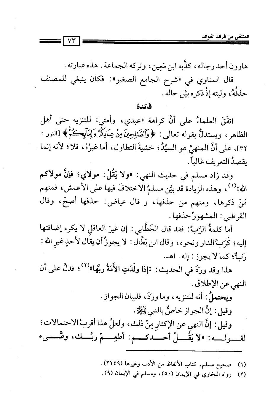 وقد زاد مسلم في حديث النهي: ((ولا يقل: مولاي؛ فإن مولاكم الله)) (¬1) ، وهذه الزيادة قد بين مسلم الاختلاف فيها على الأعمش فمنهم من ذكرها، ومنهم من حذفها، وقال عياض: حذفها أصح، وقال القرطبي: المشهور حذفها.