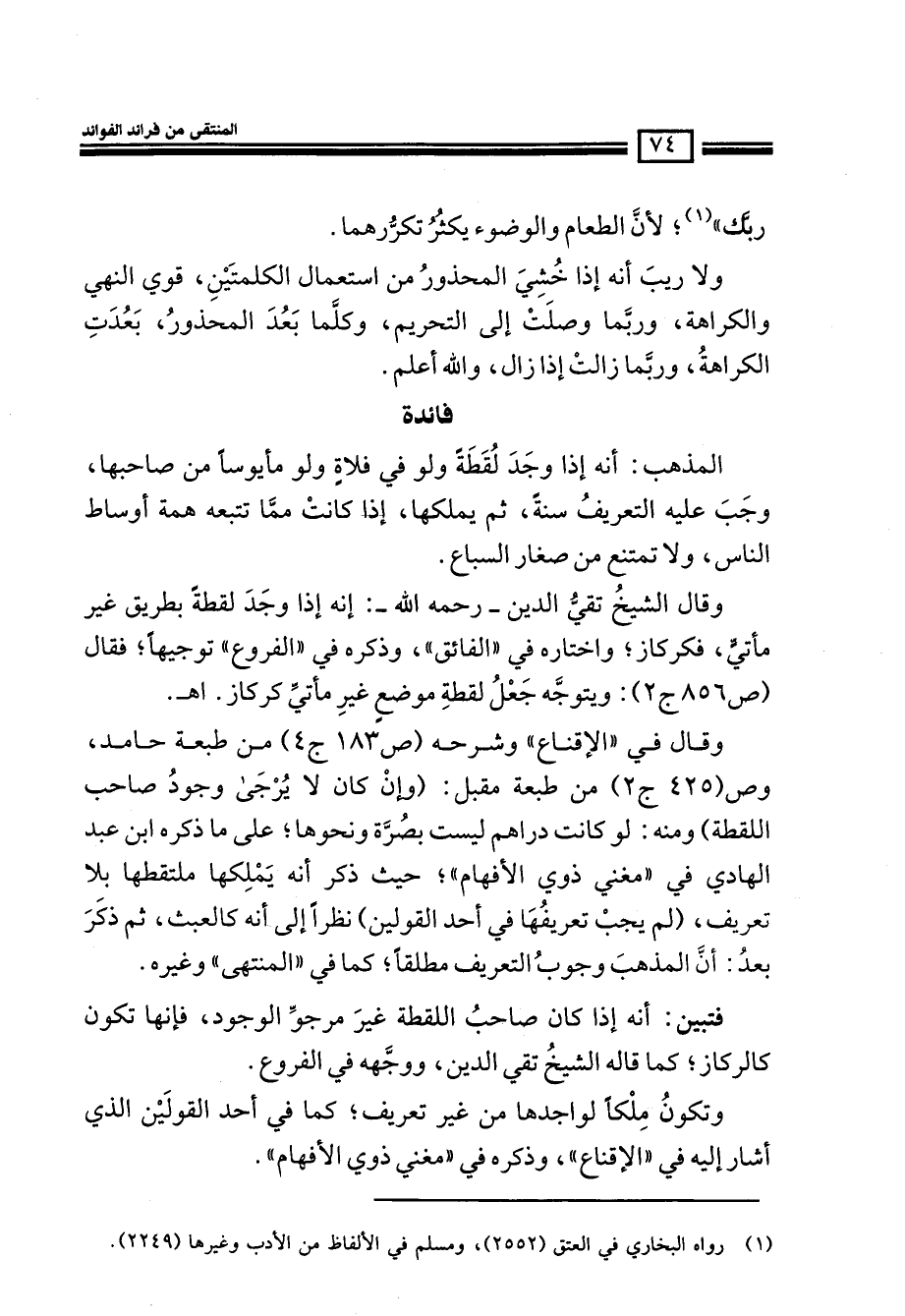 وقال في ((الإقناع)) وشرحه (ص183ج4) من طبعة حامد، وص (425ج2) من طبعة مقبل: (وإن كان لا يرجي وجود صاحب اللقطة) ومنه: لو كانت دراهم ليست بصرة ونحوها؛ على ما ذكره ابن عبد الهادي في ((مغني ذوي الأفهام)) ؛ حيث ذكر أنه يملكها ملتقطها بلا تعريف، (لم يجب تعريفها في أحد القولين) نظراً إلى أنه كالعبث، ثم ذكر بعد: أن المذهب وجوب التعريف مطلقاً، كما في ((المنتهى) وغيره.