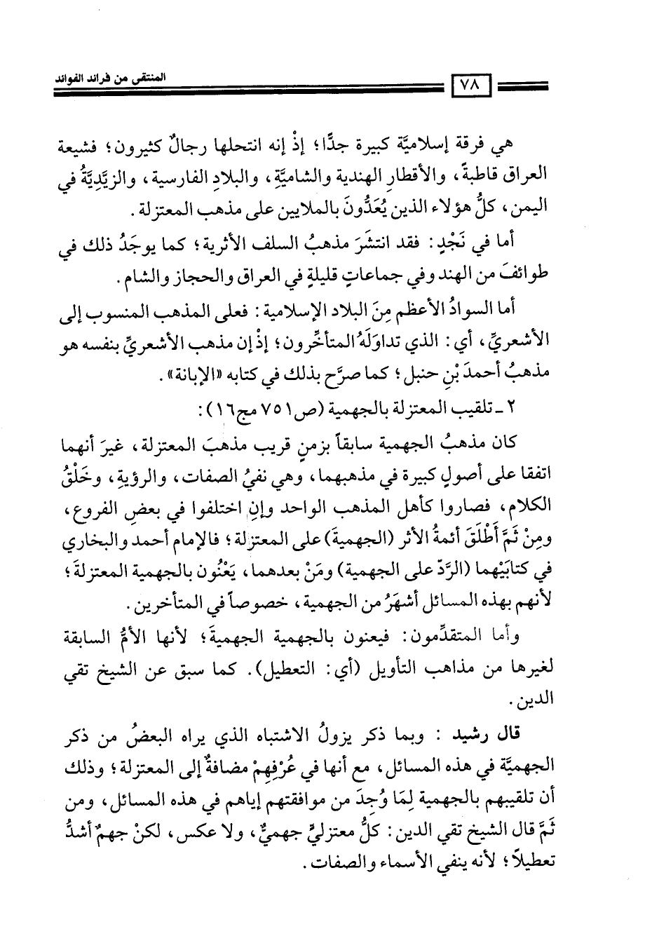 قال رشيد: وبما ذكر يزول الاشتباه الذي يراه البعض من ذكر الجهمية في هذه المسائل، مع أنها في عرفهم مضافة إلى المعتزلة وذلك أن تلقيبهم بالجهمية لما وجد من موافقتهم إياهم في هذه المسائل، ومن ثم قال الشيخ تقي الدين: كل معتزلي جهمي، ولا عكس، لكن جهم اشد تعطيلاً، لأنه ينفي الأسماء والصفات.