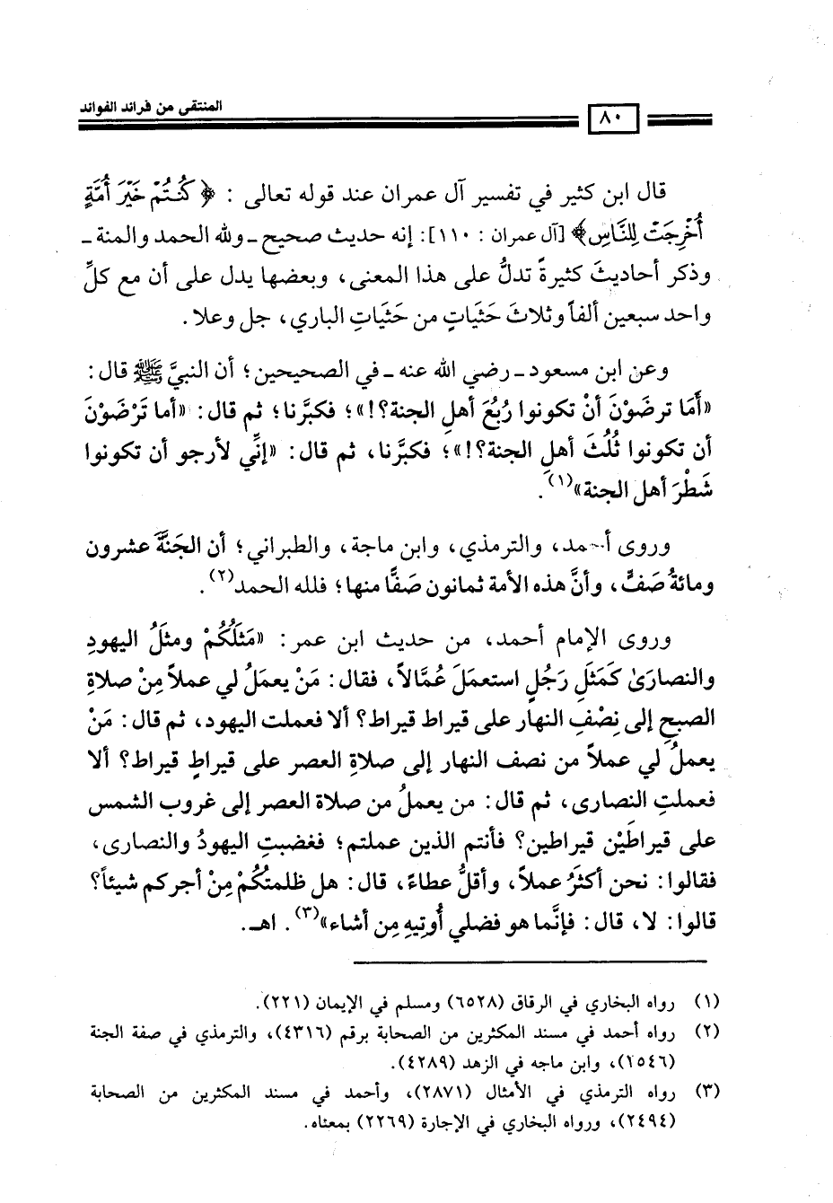 قال ابن كثير في تفسير آل عمران عند قوله تعالى: (كُنْتُمْ خَيْرَ أُمَّةٍ أُخْرِجَتْ لِلنَّاسِ) (آل عمران: 110) ، إنه حديث صحيح- ولله الحمد والمنة- وذكر أحاديث كثيرة تدل على هذا المعنى، وبعضها يدل على أن مع كل واحد سبعين ألفاً وثلاث حثيات من حثيات الباري، جل وعلا.