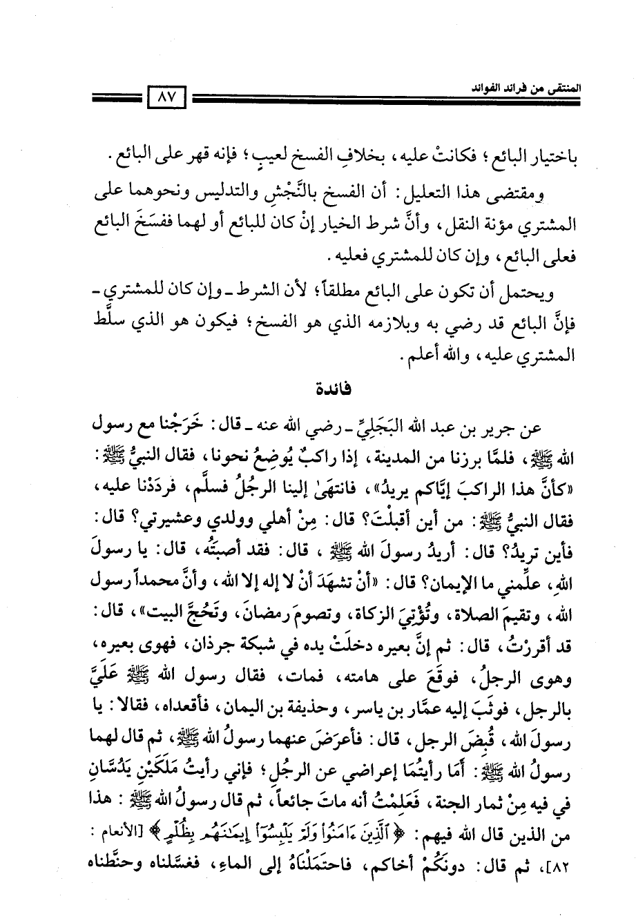 عن جرير بن عبد الله البجلي- رضي الله عنه- قال: خرجنا مع رسول الله صلى الله عليه وسلم، فلما برزنا من المدينة، إذا راكب يوضع نحونا، فقال النبي صلى الله عليه وسلم: ((كأن هذا الراكب إياكم يريد)) فانتهى إلينا الرجل فسلم، فرددنا عليه، فقال النبي صلى الله عليه وسلم: من أين أقبلت؟ قال: من أهلي وولدي وعشيرتي؟ قال: فأين تريد؟ قال: أريد رسول الله صلى الله عليه وسلم، قال: فقد أصبته، قال: يا رسول الله علمني ما الإيمان؟ قال: ((أن تشهد أن لا إله إلا الله، وأن محمداً رسول الله، وتقيم الصلاة، وتؤتي الزكاة، وتصوم رمضان، وتحج البيت)) قال: قد أقررت، قال: ثم إن بعيره دخلت يده في شبكة جرذان، فهوى بعيره، وهوى الرجل، فوقع على هامته، فمات، فقال رسول الله صلى الله عليه وسلم على بالرجل، فوثب إليه عمار بن ياسر، وحذيفة بن اليمان، فأقعداه، فقالا: يا رسول الله، قبض الرجل، قال: فأعرض عنهما رسول الله صلى الله عليه وسلم، ثم قال لهما رسول الله صلى الله عليه وسلم: أما رأيتما إعراضي عن الرجل؛ فإني رأيت ملكين يدسان في فيه من ثمار الجنة، فعلمت أنه مات جائعاً ثم قال رسول الله صلى الله عليه وسلم: هذا من الذين قال الله فيهم: (الَّذِينَ آمَنُوا وَلَمْ يَلْبِسُوا إِيمَانَهُمْ بِظُلْمٍ) (الأنعام: 82) ، ثم قال: دونكم أخاكم، فاحتملناه إلى الماء، فغسلناه وحنطناه
