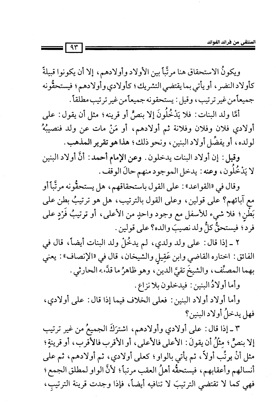 وفلان فلانة ثم أولادهم، أو من مات عن ولد فنصيبه لولده، أو يفضل أولاد البنين، ونحو ذلك؛ هذا هو تقرير المذهب.
