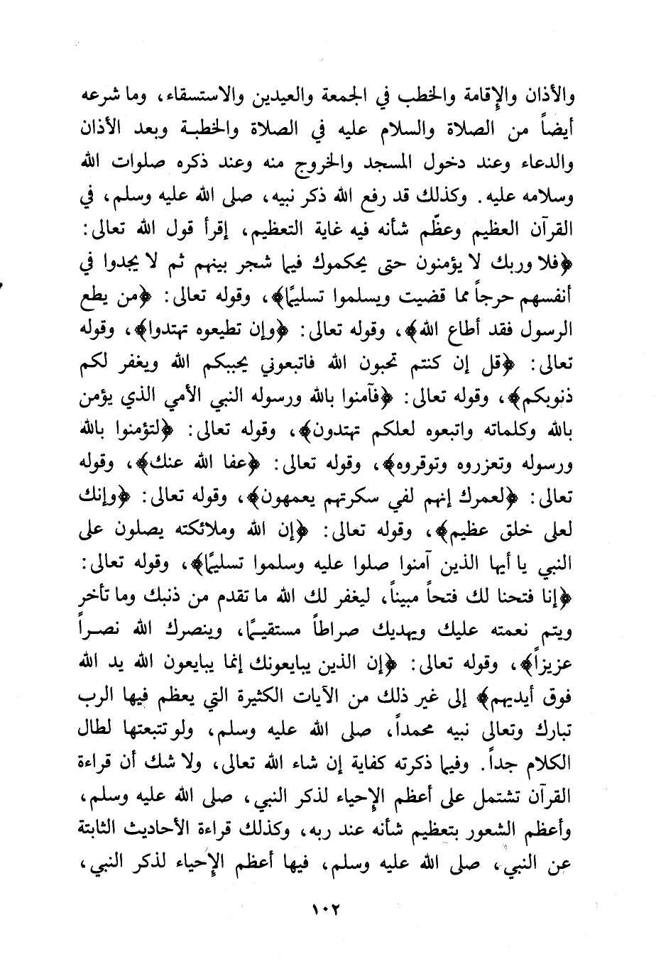 والأذان والإقامة والخطب في الجمعة والعيدين والاستسقاء وما شرعه أيضًا من الصلاة والسلام عليه في الصلاة والخطبة وبعد الأذان والدعاء وعند دخول المسجد والخروج منه وعند ذكره صلوات الله وسلامه عليه وكذلك قد رفع الله ذكر نبيه - صلى الله عليه وسلم - في القرآن العظيم وعظم شأنه فيه غاية التعظيم اقرأ قول الله تعالى: {فَلَا وَرَبِّكَ لَا يُؤْمِنُونَ حَتَّى يُحَكِّمُوكَ فِيمَا شَجَرَ بَيْنَهُمْ ثُمَّ لَا يَجِدُوا فِي أَنْفُسِهِمْ حَرَجًا مِمَّا قَضَيْتَ وَيُسَلِّمُوا تَسْلِيمًا *} وقوله تعالى: {مَنْ يُطِعِ الرَّسُولَ فَقَدْ أَطَاعَ اللَّهَ} وقوله تعالى: {وَإِنْ تُطِيعُوهُ تَهْتَدُوا} وقوله تعالى: {قُلْ إِنْ كُنْتُمْ تُحِبُّونَ اللَّهَ فَاتَّبِعُونِي يُحْبِبْكُمُ اللَّهُ وَيَغْفِرْ لَكُمْ ذُنُوبَكُمْ} وقوله تعالى: {فَآَمِنُوا بِاللَّهِ وَرَسُولِهِ النَّبِيِّ الْأُمِّيِّ الَّذِي يُؤْمِنُ بِاللَّهِ وَكَلِمَاتِهِ وَاتَّبِعُوهُ لَعَلَّكُمْ تَهْتَدُونَ} وقوله تعالى: {لِتُؤْمِنُوا بِاللَّهِ وَرَسُولِهِ وَتُعَزِّرُوهُ وَتُوَقِّرُوهُ} وقوله تعالى: {عَفَا اللَّهُ عَنْكَ} وقوله تعالى: {لَعَمْرُكَ إِنَّهُمْ لَفِي سَكْرَتِهِمْ يَعْمَهُونَ} وقوله تعالى: {وَإِنَّكَ لَعَلى خُلُقٍ عَظِيمٍ} وقوله تعالى: {إِنَّ اللَّهَ وَمَلَائِكَتَهُ يُصَلُّونَ عَلَى النَّبِيِّ يَا أَيُّهَا الَّذِينَ آَمَنُوا صَلُّوا عَلَيْهِ وَسَلِّمُوا تَسْلِيمًا} وقوله تعالى: {إِنَّا فَتَحْنَا لَكَ فَتْحًا مُبِينًا * لِيَغْفِرَ لَكَ اللَّهُ مَا تَقَدَّمَ مِنْ ذَنْبِكَ وَمَا تَأَخَّرَ وَيُتِمَّ نِعْمَتَهُ عَلَيْكَ وَيَهْدِيَكَ صِرَاطًا مُسْتَقِيمًا * وَيَنْصُرَكَ اللَّهُ نَصْرًا عَزِيزًا} وقوله تعالى: {إِنَّ الَّذِينَ يُبَايِعُونَكَ إِنَّمَا يُبَايِعُونَ اللَّهَ يَدُ اللَّهِ فَوْقَ أَيْدِيهِمْ} إلى غير ذلك من الآيات الكثيرة التي يعظم