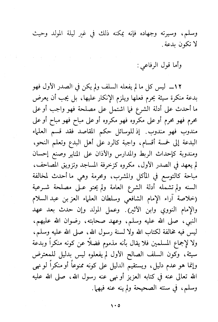 12 - ليس كل ما لم يفعله السلف ولم يكن في الصدر الأول فهو بدعة منكر سيئة يحرم فعلها ويلزم الإنكار عليها بل يجب أن يعرض ما أحدث على أدلة الشرع فما اشتمل على مصلحة فهو واجب أو على محرم فهو محرم أو على مكروه فهو مكروه أو على مباح فهو مباح أو على مندوب فهو مندوب، إذ للوسائل حكم المقاصد فقد قسم العلماء البدعة إلى خمسة أقسام، واجبة كالرد على أهل البدع وتعلم النحو، ومندوبة كإحداث الربط والمدارس والأذان على المنابر وصنع إحسان لم يع هد في الصدر الأول، مكروه كزخرفة المساجد وتزويق المصاحف مباحة كالتوسع في المأكل والمشرب، ومحرمة وهي ما أحدث لمخالفة السنة ولم تشمله أدلة الشرع العامة ولم يحتو على مصلحة شرعية (خلاصة آراء الإمام الشافعي وسلطان العلماء العز بن عبد السلام والإمام النووي وابن الأثير) وعمل المولد وإن حدث بعد عهد النبي - صلى الله عليه وسلم - وعهد صحابته رضوان الله عليهم ليس فيه مخالفة لكتاب الله ولا لسنة رسول الله - صلى الله عليه وسلم - ولا لإجماع المسلمين فلا يقال بأنه مذموم فضلا عن كونه منكرًا وبدعة سيئة وكون السلف الصالح الأول لم يفعلوه ليس بدليل للمعترض وإنما هو عدم دليل، ويستقيم الدليل على كونه ممنوعًا أو منكرا لو نهى الله تعالى عنه في كتابه العزيز أو نهى عنه رسول الله - صلى الله عليه وسلم - في سنته الصحيحة ولم ينه عنه فيهما.