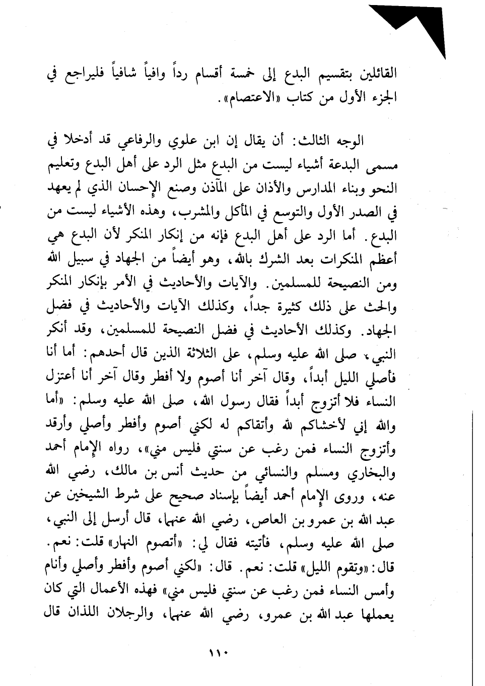 الوجه الثالث: أن يقال إن ابن علوي والرفاعي قد أدخلا في مسمى البدعة أشياء ليست من البدع مثل الرد على أهل البدع وتعليم النحو وبناء المدارس والأذن على المآذن وصنع الإحسان الذي لم يعهد في الصدر الأول والتوسع في المأكل والمشرب، وهذه الأشياء ليست من البدع. ما الرد على أهل البدع فإنه من إنكار المنكر لأن البدع هي أعظم المنكرات بعد الشرك بالله، وهو أيضًا من الجهاد في سبيل الله ومن النصيحة للمسلمين. والآيات والأحاديث في الأمر بإنكار المنكر والحث على ذلك كثيرة جدًا وكذلك الآيات والأحاديث في فضل الجهاد. وكذلك الأحاديث في فضل النصيحة للمسلمين وقد أنكر النبي - صلى الله عليه وسلم - على الثلاثة الذين قال أحدهم: أما أنا فأصلي الليل أبدًا وقال آخر أنا أصوم ولا أفطر وقال آخر أنا أعتزل النساء فلا أتزوج أبدًا فقال رسول الله ص: «أما والله إني لأخشاكم لله وأتقاكم له لكني أصوم وأفطر وأصلي ورقد وأتزوج النساء فمن رغب عن سنتي فليس مني» رواه الإمام أحمد والبخاري ومسلم والنسائي من حديث أنس بن مالك رضي الله عنه، وروى الإمام أحمد أيضًا بإسناد صحيح على شرط الشيخين عن عبد الله بن عمرو بن العاص، رضي الله عنهما قال أرسل إلى النبي - صلى الله عليه وسلم - فأتيته فقال لي: «أتصوم النهار» قلت: نعم قال: «وتقوم الليل» قلت: نعم قال: «لكني أصوم وأفطر وأصلي وأنام وأمس النساء فمن رغب عن سنتي فليس مني» فهذه الأعمال التي كان يعملها عبد الله بن عمرو رضي الله عنهما والرجلان اللذان قال