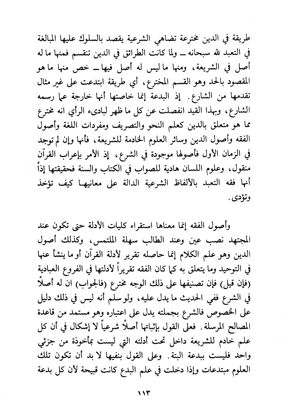 طريقة في الدين مخترعة تضاهي الشرعية يقصد بالسلوك عليها المبالغة في التعبد لله -سبحانه-: ولما كانت الطرائق في الدين تنقسم، فمنها ما له أصل في الشريعة، ومنها ما ليس له أصل فيها، خص منها ما هو المقصود بالحد وهو القسم المخترع: أي طريقة ابتدعت على غير مثال تقدمها من الشارع، إذ البدعة إنما خاصتها: أنها خارجة عما رسمه الشارع، وبهذا القيد انفصلت عن كل ما ظهر لبادئ الرأي أنه مخترع مما هو متعلق بالدين: كعلم النحو، والتصريف، ومفردات اللغة وأصول الفقه وأصول الدين، وسائر العلوم الخادمة للشريعة، فأنها وإن لم توجد في الزمان الأول فأصولها موجودة في الشرع، إذ الأمر بإعراب القرآن منقول، وعلوم اللسان هادية للصواب في الكتاب والسنة، فحقيقتها إذًا أنها فقه التعبد بالألفاظ الشرعية الدالة على معانيها كيف تؤخذ وتؤدى.