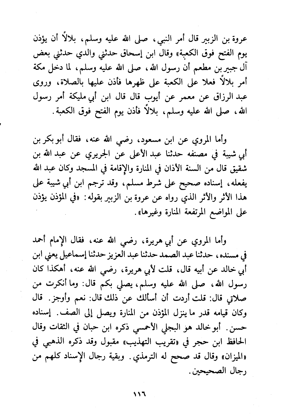 وأما المروي عن ابن مسعود رضي الله عنه، فقال أبو بكر بن أبي شيبة في مصنفه: حدثنا عبد الأعلى عن الجريري عن عبد الله بن شقيق، قال: من السنة الأذان في المنارة، والإقامة في المسجد، وكان عبد الله يفعله إسناده صحيح على شرط مسلم، وقد ترجم ابن أبي شيبة على هذا الأثر، والأثر الذي رواه عن عروة بن الزبير بقوله: «في المؤذن يؤذن على المواضع المرتفعة المنارة وغيرها».