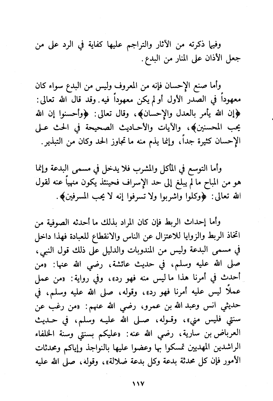 وأما صنع الإحسان فإنه من المعروف، وليس من البدع سواء كان معهودًا في الصدر الأول أو لم يكن معهودا فيه، وقد قال الله تعالى: {إِنَّ اللَّهَ يَامُرُ بِالْعَدْلِ وَالْإِحْسَانِ}، وقال تعالى: {وَأَحْسِنُوا إِنَّ اللَّهَ يُحِبُّ الْمُحْسِنِينَ}، والآيات والأحاديث الصحيحة في الحث على الإحسان كثيرة جدًا، وإنما يذم منه ما تجاوز الحد وكان من التبذير.