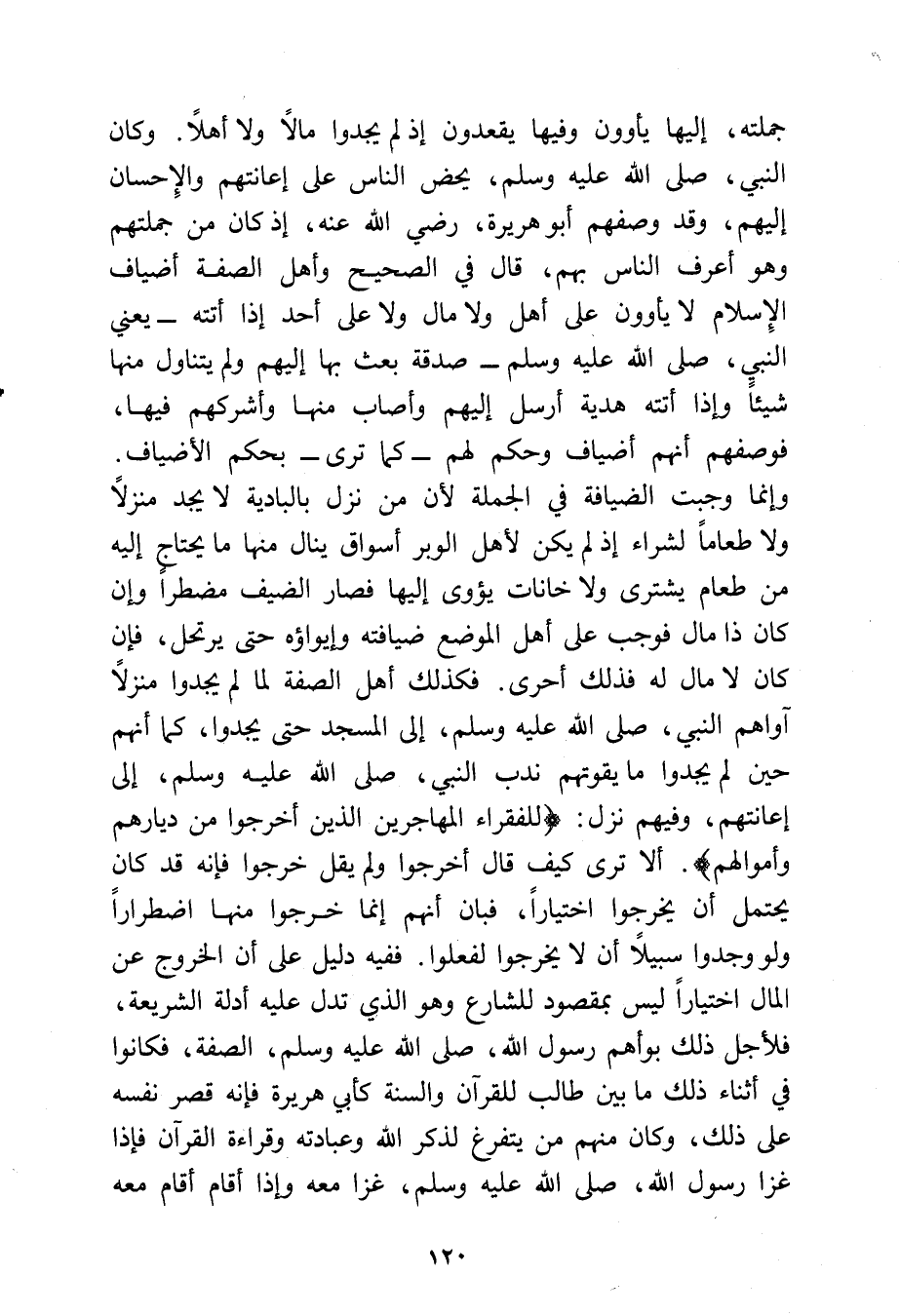 يرتحل، فإن كان لا مال له فذلك أحرى فكذلك أهل الصفة لما لم يجدوا منزلا آواهم النبي - صلى الله عليه وسلم - إلى المسجد حتى يجدوا، كما أنهم حين لم يجدوا ما يقوتهم ندب النبي - صلى الله عليه وسلم - إلى إعانتهم وفيهم نزل {لِلْفُقَرَاءِ الْمُهَاجِرِينَ الَّذِينَ أُخْرِجُوا مِنْ دِيارِهِمْ وَأَمْوَالِهِمْ} ألا ترى كيف قال: أخرجوا ولم يقل: خرجوا فإنه قد كان يحتمل أن يخرجوا اختيارًا فبان أنهم إنما خرجوا منها اضطرارًا ولو وجدوا سبيلا أن لا يخرجوا لفعلوا، ففيه دليل على أن الخروج عن المال اختيارًا ليس بمقصود للشارع وهو الذي تدل عليه أدلة الشريعة فلأجل ذلك بوأهم رسول الله - صلى الله عليه وسلم - الصفة فكانوا في أثناء ذلك ما بين طالب للقرآن والسنة كأبي هريرة فإنه قصر نفسه على ذلك، وكان منهم من يتفرغ لذكر الله وعبادته وقراءة القرآن فإذا غزا رسول الله - صلى الله عليه وسلم - غزا معه وإذا أقام أقام معه