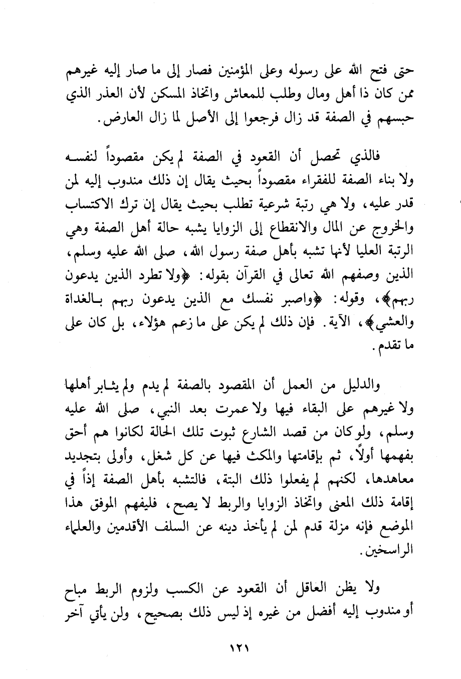 فالذي تحصل أن القعود في الصفة لم يكن مقصودًا لنفسه ولا بناء الصفة للفقراء مقصودًا بحيث يقال إن ذلك مندوب إليه لمن قدر عليه، ولا هي رتبة شرعية تطلب بحيث يقال إن ترك الاكتساب والخروج عن المال والانقطاع إلى الزوايا يشبه حالة أهل الصفة وهي الرتبة العليا؛ لأنها تشبه بأهل صفة رسول الله - صلى الله عليه وسلم - الذين وصفهم الله تعالى في القرآن بقوله: {وَلَا تَطْرُدِ الَّذِينَ يَدْعُونَ رَبَّهُمْ}، وقوله: {وَاصْبِرْ نَفْسَكَ مَعَ الَّذِينَ يَدْعُونَ رَبَّهُمْ بِالْغَدَاةِ وَالْعَشِيِّ} الآية فإن ذلك لم يكن على ما زعم هؤلاء بل كان على ما تقدم.