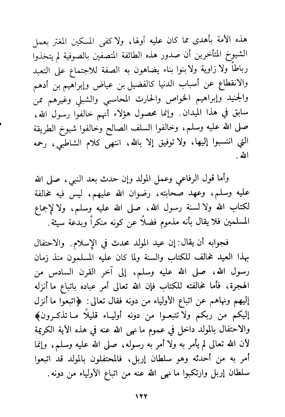 وأما قول الرفاعي وعمل المولد وإن حدث بعد النبي - صلى الله عليه وسلم - وعهد صحابته رضوان الله عليهم ليس فيه مخالفة لكتاب الله ولا لسنة رسول الله - صلى الله عليه وسلم - ولا لإجماع المسلمين فلا يقال بأنه مذموم فضلا عن كونه منكرًا وبدعة سيئة.