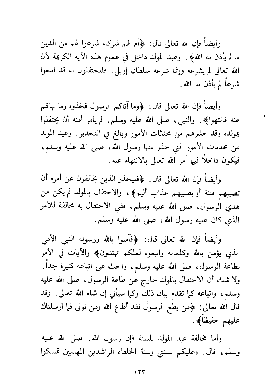 وأيضا فإن الله تعالى قال: {أَمْ لَهُمْ شُرَكَاءُ شَرَعُوا لَهُمْ مِنَ الدِّينِ مَا لَمْ يَاذَنْ بِهِ اللَّهُ} وعيد المولد داخل في عموم هذه الآية الكريمة لأن الله تعالى لم يشرعه وإنما شرعه سلطان إربل، فالمحتفلون به قد اتبعوا شرعًا لم يأذن به الله.