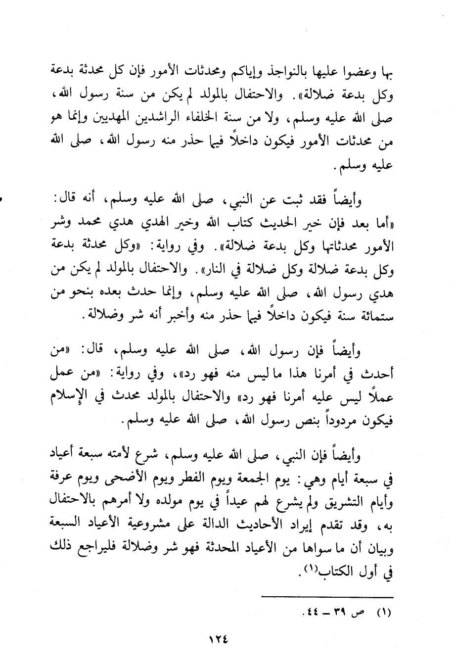 وأيضًا فإن النبي - صلى الله عليه وسلم - شرع لأمته سبعة أعياد في سبعة أيام وهي يوم الجمعة ويوم الفطر ويوم الأضحى ويوم عرفة وأيام التشريق، ولم يشرع لهم عيدًا في يوم مولده ولا أمرهم بالاحتفال به، وقد تقدم إيراد الأحاديث الدالة على مشروعية الأعياد السبعة وبيان أن ما سواها من الأعياد المحدثة فهو شر وضلالة فليراجع ذلك في أول الكتاب (¬1).