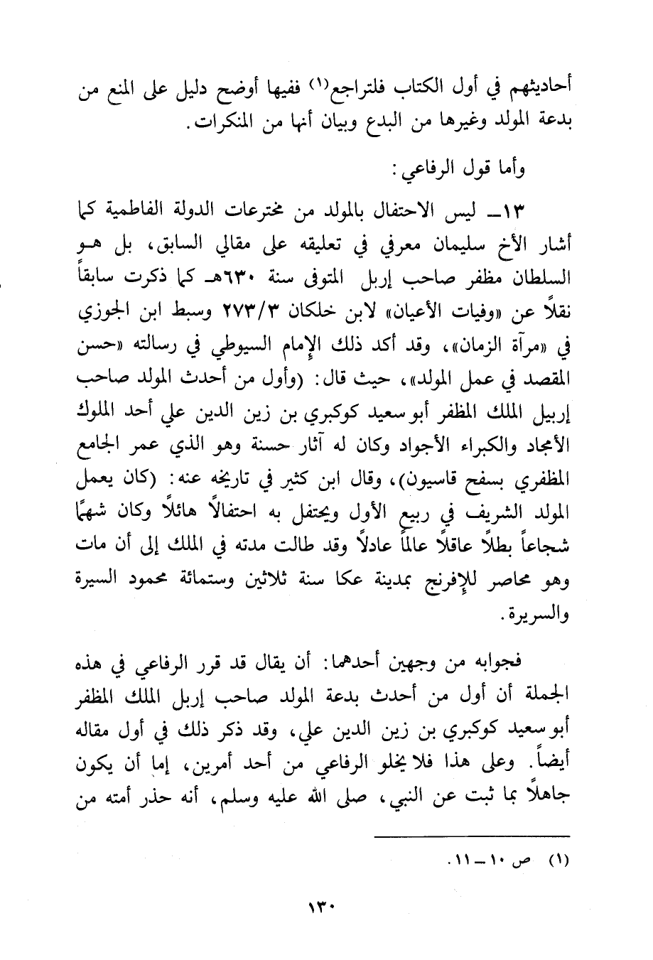 فجوابه من وجهين أحدهما: أن يقال قد قرر الرفاعي في هذه الجملة أن أول من أحدث بدعة المولد صاحب إربل الملك المظفر أبو سعيد كوكبري بن زين الدين علي، وقد ذكر ذلك في أول مقاله أيضًا وعلى هذا فلا يخلو الرفاعي من أحد أمرين إما أن يكون جاهلا بما ثبت عن النبي - صلى الله عليه وسلم - أنه حذر أمته من