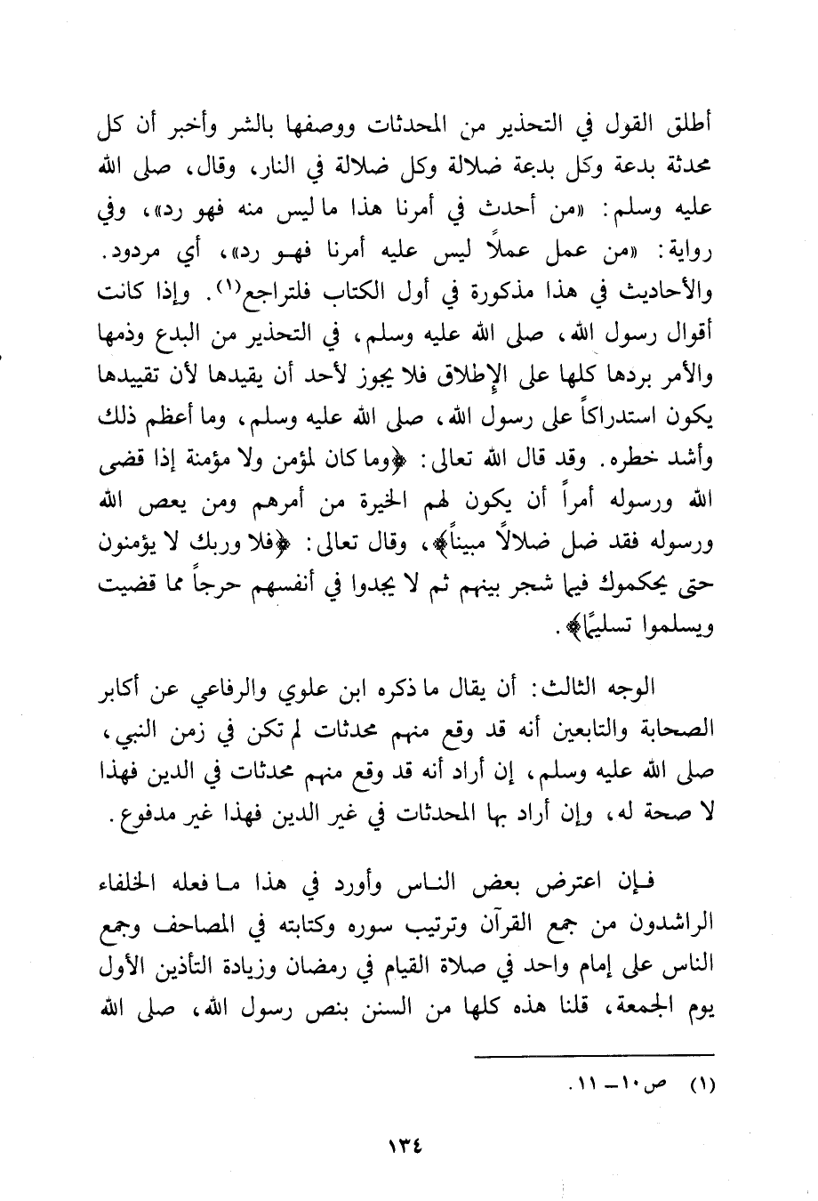 فإن اعترض بعض الناس وأورد في هذا ما فعله الخلفاء الراشدون من جمع القرآن وترتيب سوره وكتابته في المصاحف وجمع الناس على إمام واحد في صلاة القيام في رمضان وزيادة التأذين الأول يوم الجمعة قلنا هذه كلها من السنن بنص رسول الله - صلى الله