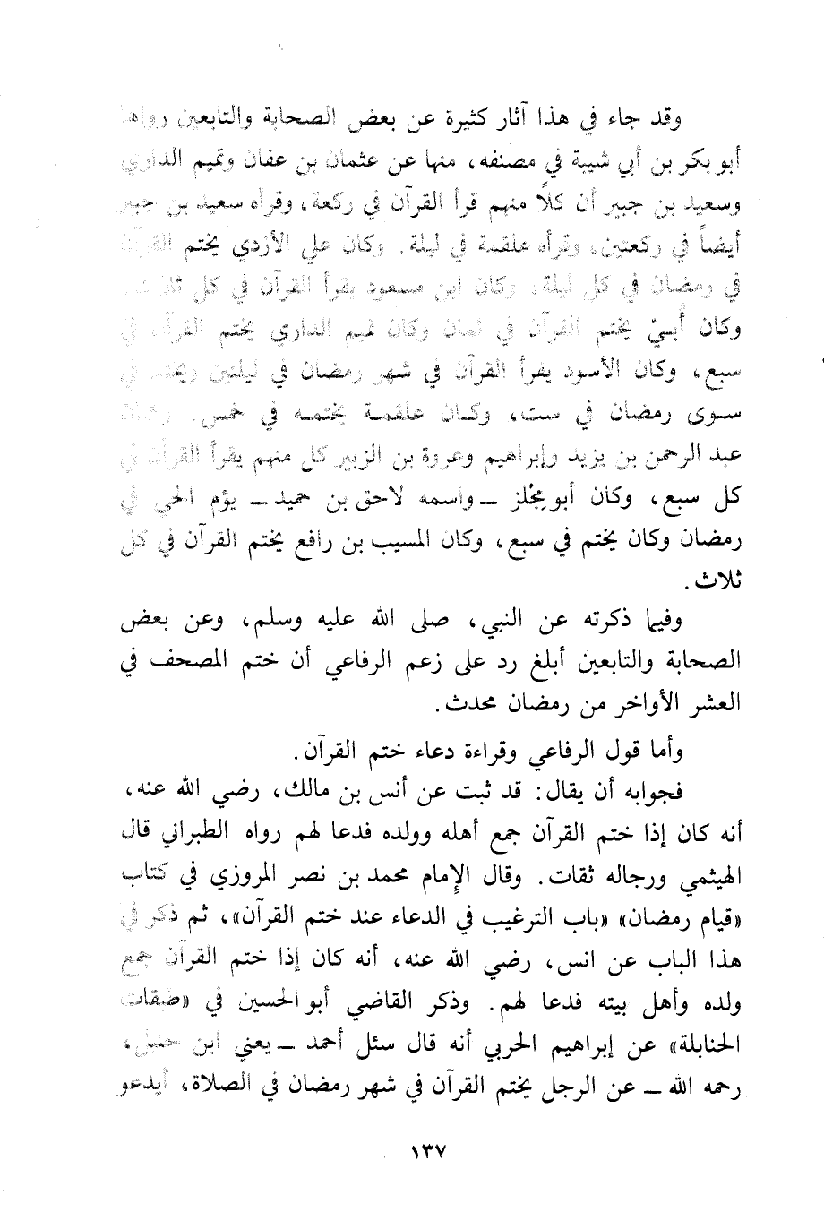 وقد جاء في هذا آثار كثيرة عن بعض الصحابة والتابعين رواها أبو بكر بن أبي شيبة في مصنفه، منها عن عثمان بن عفان وتميم الداري وسعيد بن جبير أن كلا منهم قرأ القرآن في ركعة، وقرأه سعيد بن جبير أيضًا في ركعتين، وقرأه علقمة في ليلة وكان علي الأزدي يختم القرآن في رمضان في كل ليلة، وكان ابن مسعود يقرأ القرآن في كل ثلاث، وكان أبي يختم القرآن في ثمان وكان تميم الداري يختم القرآن في سبع، وكان الأسود يقرأ القرآن في شهر رمضان في ليلتين ويختم في سوى رمضان في ست، وكان علقمة يختمه في خمس، وكان عبد الرحمن بن يزيد وإبراهيم وعروة بن الزبير كل منهم يقرأ القرآن في كل سبع، وكان أبو مجلز واسمه لاحق بن حميد يؤم الحي في رمضان وكان يختم في سبع، وكان المسيب بن رافع يختم القرآن في كل ثلاث.