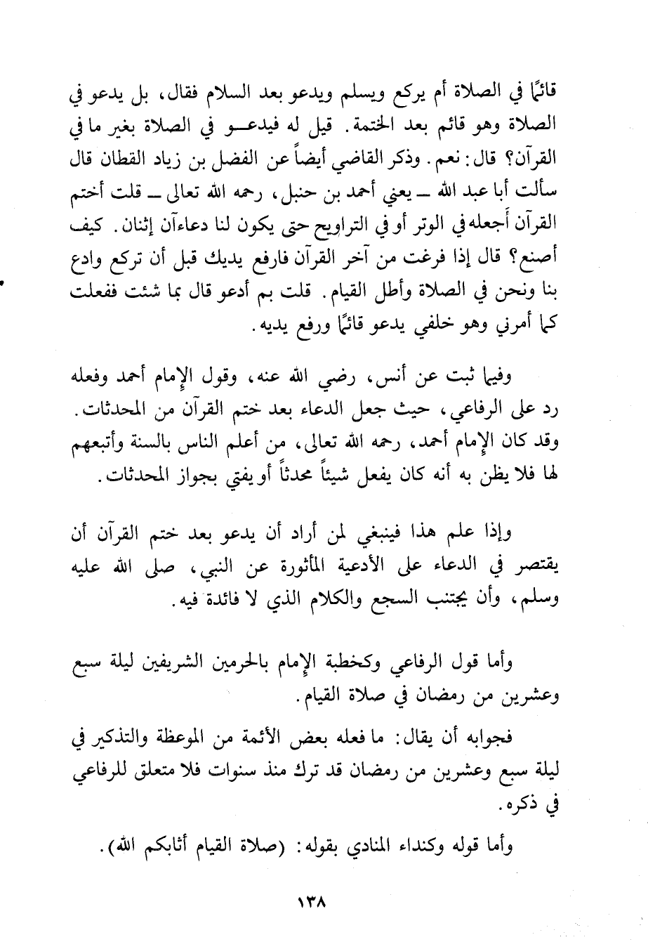 قائمًا في الصلاة أم يركع ويسلم ويدعو بعد السلم فقال: بل يدعو في الصلاة وهو قائم بعد الختمة، قيل له فيدعو في الصلاة بغير ما في القرآن؟ قال: نعم، وذكر القاضي أيضا عن الفضل بن زياد القطان قال: سألت أبا عبد الله يعني أحمد بن حنبل رحمه الله تعالى قلت: أختم القرآن أجعله في الوتر أو في التراويح حتى يكون لنا دعاءان اثنان كيف أصنع؟ قال إذا فرغت من آخر القرآن فارفع يديك قبل أن تركع وادع بنا ونحن في الصلاة وأطل القيام قلت بم أدعو؟ قال: بما شئت ففعلت كما أمرني وهو خلفي يدعو قائمًا ورفع يديه.
