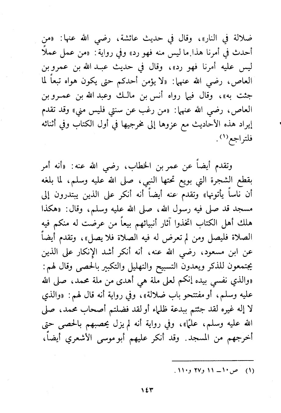 وتقدم أيضًا عن عمر بن الخطاب رضي الله عنه: أنه أمر بقطع الشجرة التي بويع تحتها النبي - صلى الله عليه وسلم - لما بلغه أن ناسًا يأتونها، وتقدم عنه أيضًا أنه أنكر على الذين يبتدرون إلى مسجد قد صلى فيه رسول الله - صلى الله عليه وسلم - وقال: «هكذا هلك أهل الكتاب اتخذوا آثار أنبيائهم بيعًا من عرضت له منكم فيه الصلاة فليصل ومن لم تعرض له فيه الصلاة فلا يصل» وتقدم أيضًا عن ابن مسعود رضي الله عنه أنه أنكر أشد الإنكار على الذين يجتمعون للذكر ويعدون التسبيح والتهليل والتكبير بالحصى وقال لهم: «والذي نفسي بيده إنكم لعلى ملة هي أهدى من ملة محمد - صلى الله عليه وسلم - أو مفتتحو باب ضلالة»